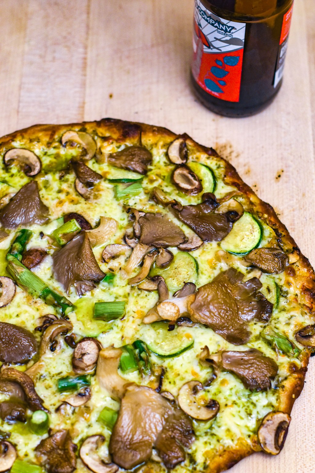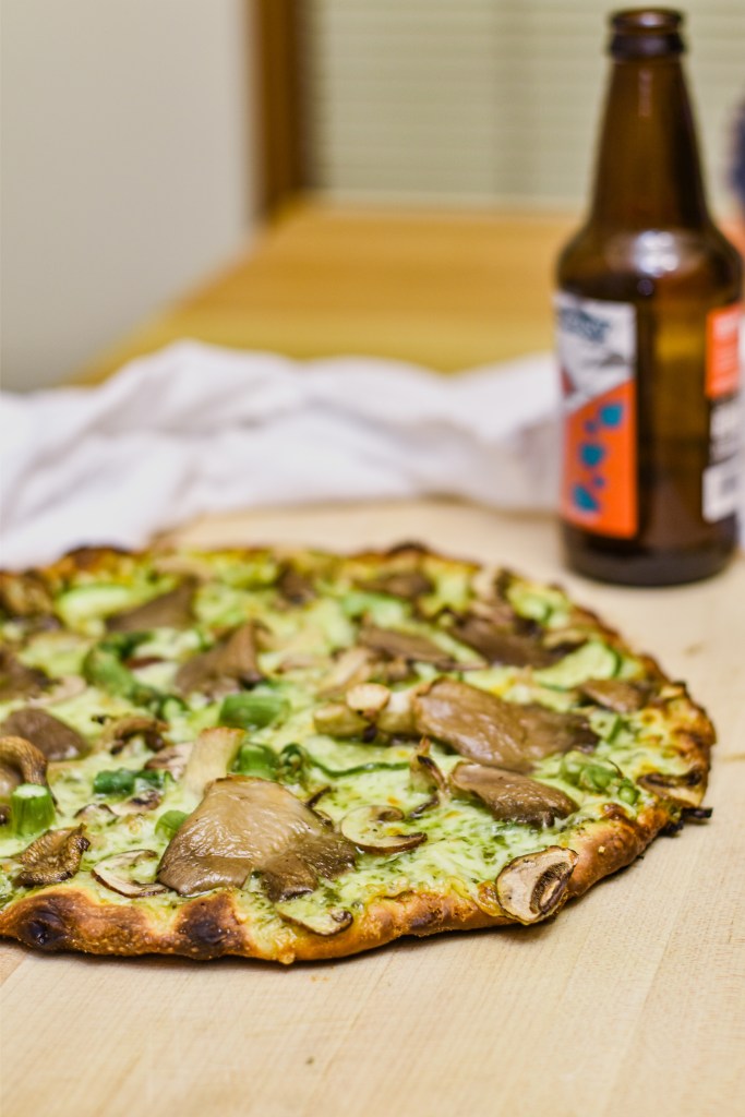 I am forever dumping all the veg on a pizza just so I can eat it once a week or so and not feel like I’m missing out on the good stuff. This one has crimini and oyster mushrooms, asparagus and zucchini with a kale/spinach pesto. It went perfect with a Ninkasi Brewing – Dawn of the Red. All the yums!
