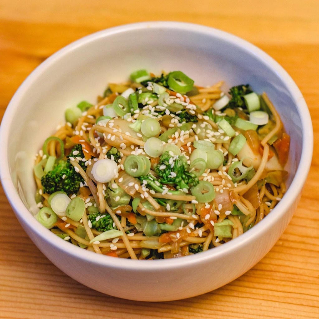 Saute onion and broccoli stems with a little oil in a large skillet or wok on med-high for about 45 seconds, stirring constantly. Add carrots and broccoli florets, stir for another 45 seconds. Add cabbage and water chestnuts, stir, use some more oil if necessary. Pour in sauce then noodles and toss to coat. Top with sliced green onion and sesame seeds if you’d like.