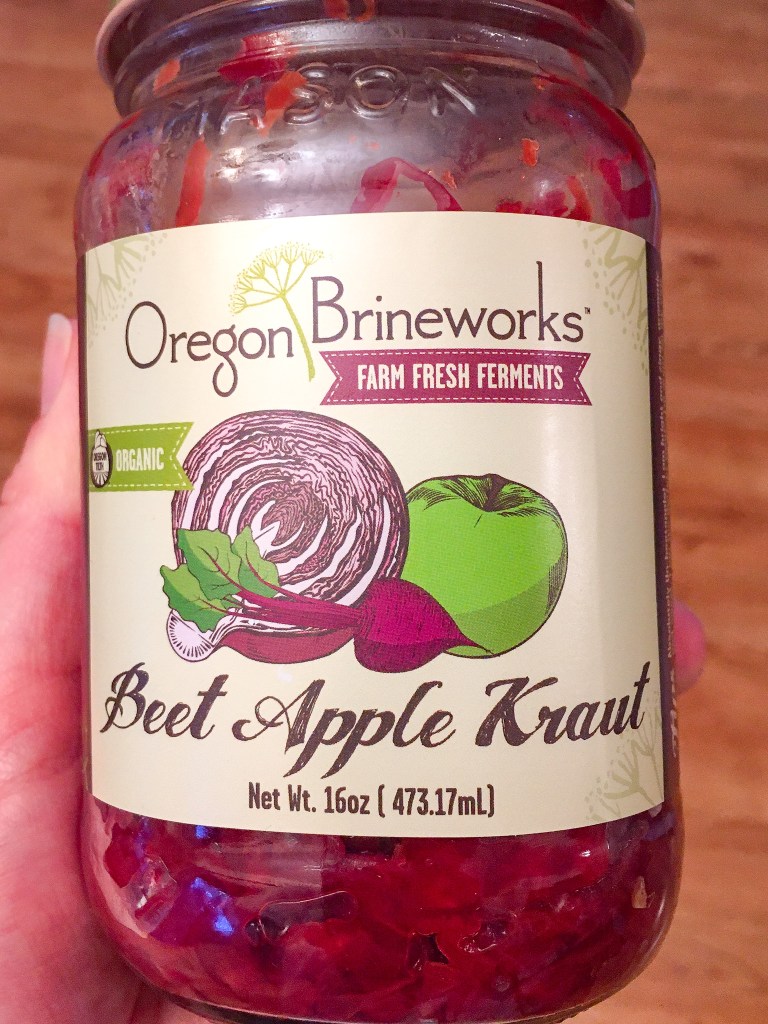 Note: Oregon Brineworks’ Beet Apple Kraut is my current obsession. While yogurt will go bad in your fridge over the next 2 month, sauerkraut will last for MONTHS-OVER A YEAR. Our stressed out bodies need probiotics to help digest our food properly, not to mention the added fiber and other nutrients coming from the veg in there. Eat some fermented veg!