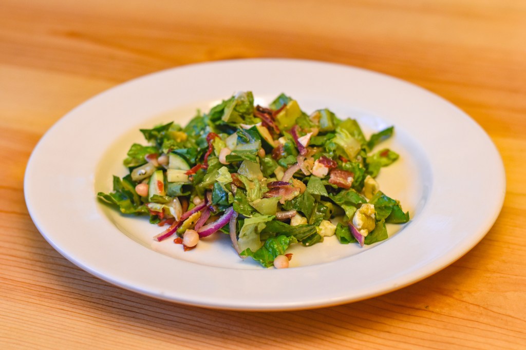 Put your eggs in a pot, fill the pot with water, enough to cover the eggs. Bring to a boil on med-high, cover and remove from the heat. Let eggs sit for 8 minutes then submerge in an ice bath while you prep the other ingredients, then chop up the eggs. Assemble salad. Whisk together dressing and toss.