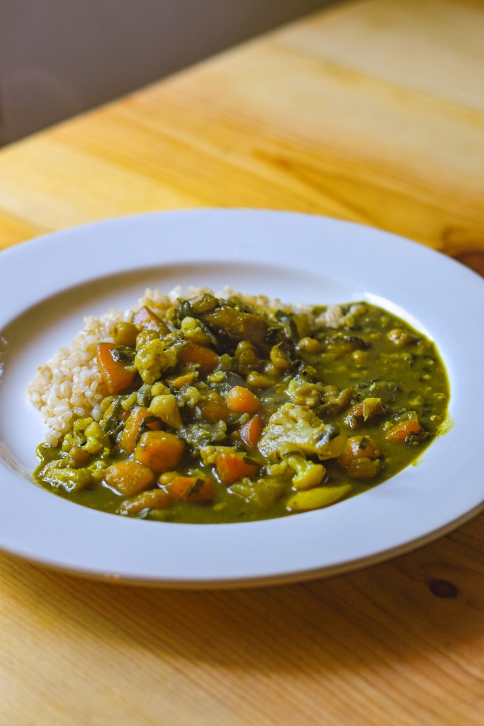 Brown chicken on both sides in a med-high dutch oven, remove (its ok if it’s not cooked through). Saute onions and garlic until soft, 2 minutes. Add curry powder and turmeric, stir until fragrant. Dump in the squash and cauliflower and stir to coat, then pour in the coconut milk, fill the can with water and pour that in too. Return chicken to the pot along with the soy sauce, chickpeas and chard. Bring to a boil and simmer for 25-40 minutes until sauce is thick, vegetables are soft and chicken is cooked. Serve over rice.