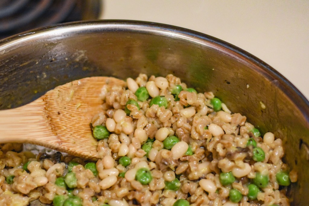 Using farro instead of arborio rice in this dish saves you from so much pot-watching! I mean, I absolutely love risotto but I am not into standing around literally watching a pot boil, waiting for the perfect second to add more broth and repeat for an hour or more. But this is super simple and faster, making it a great weeknight staple!