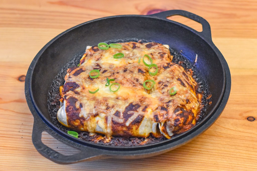 Preheat oven to 375. Saute onion and pepper with a little salt and pepper for 2-3 minutes. Add chili powder, cumin, onion powder and garlic powder. Stir. Add black beans and incorporate. Pour in water and swiss chard. Bring to a boil then simmer until almost all the liquid is gone, roughly 10-15 minutes. Stir in 1/2 the cheese then turn off the heat. Add green onion, reserving a little for garnish). Portion mixture into 4 tortillas and roll them up like burritos. Place them in a pan with 1/4c enchilada sauce on the bottom. Top with remaining sauce then cheese. Bake for 20 minutes.