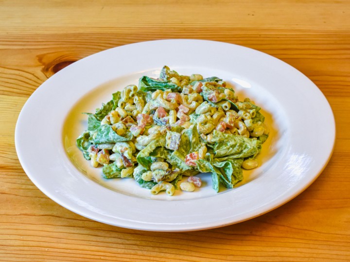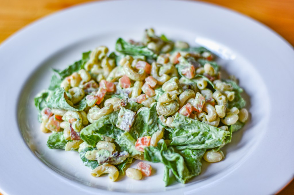 Cook bacon however you want or bake on a wire rack on a foil lined baking sheet (or just on the baking sheet) for 8-15 minutes at 400°F, depending on thickness. Keep an eye on it! Boil water and cook pasta to the package instructions. Allow pasta and bacon to cool. Chop bacon and toss everything together, then add dressing a little at a time until you like it.
