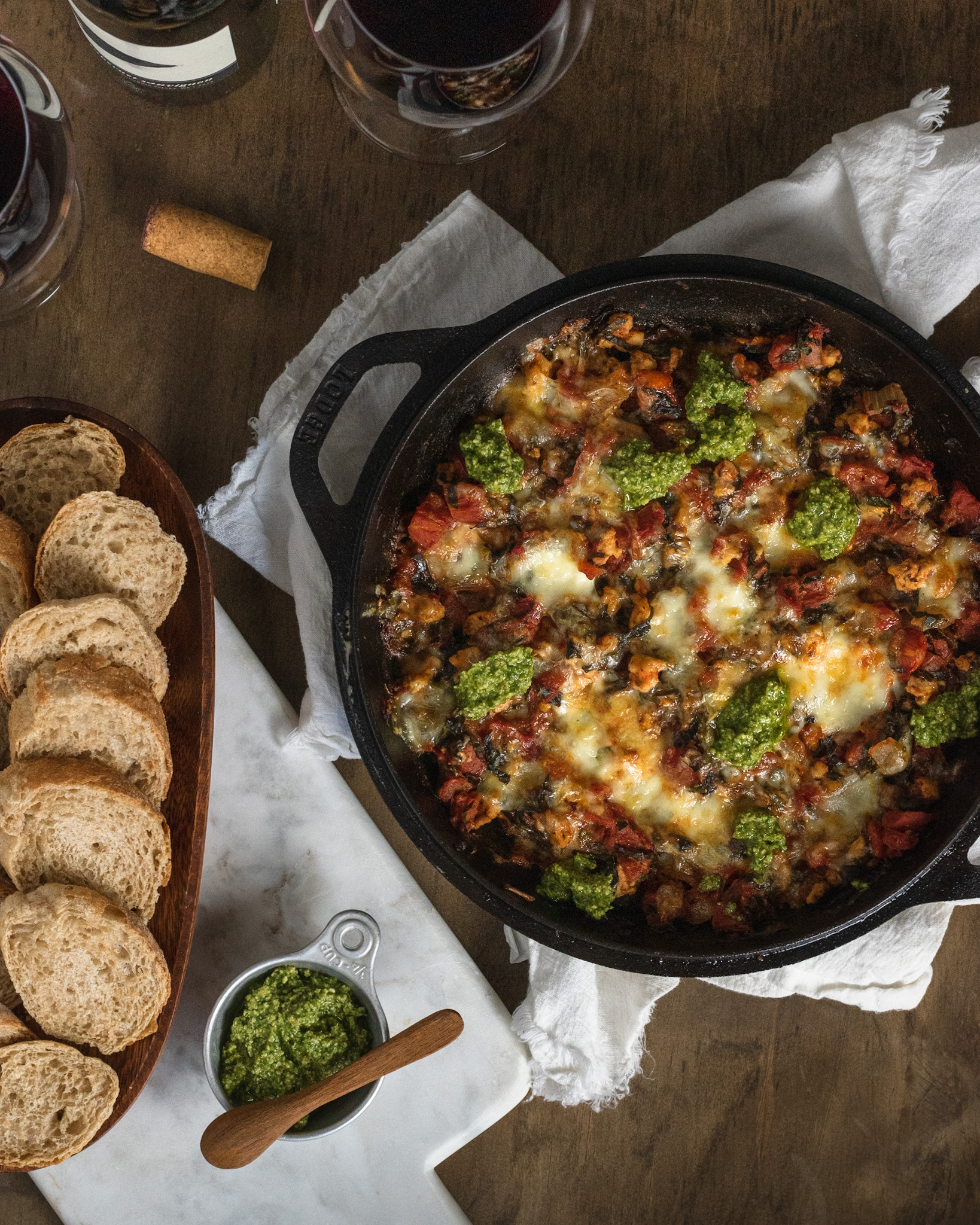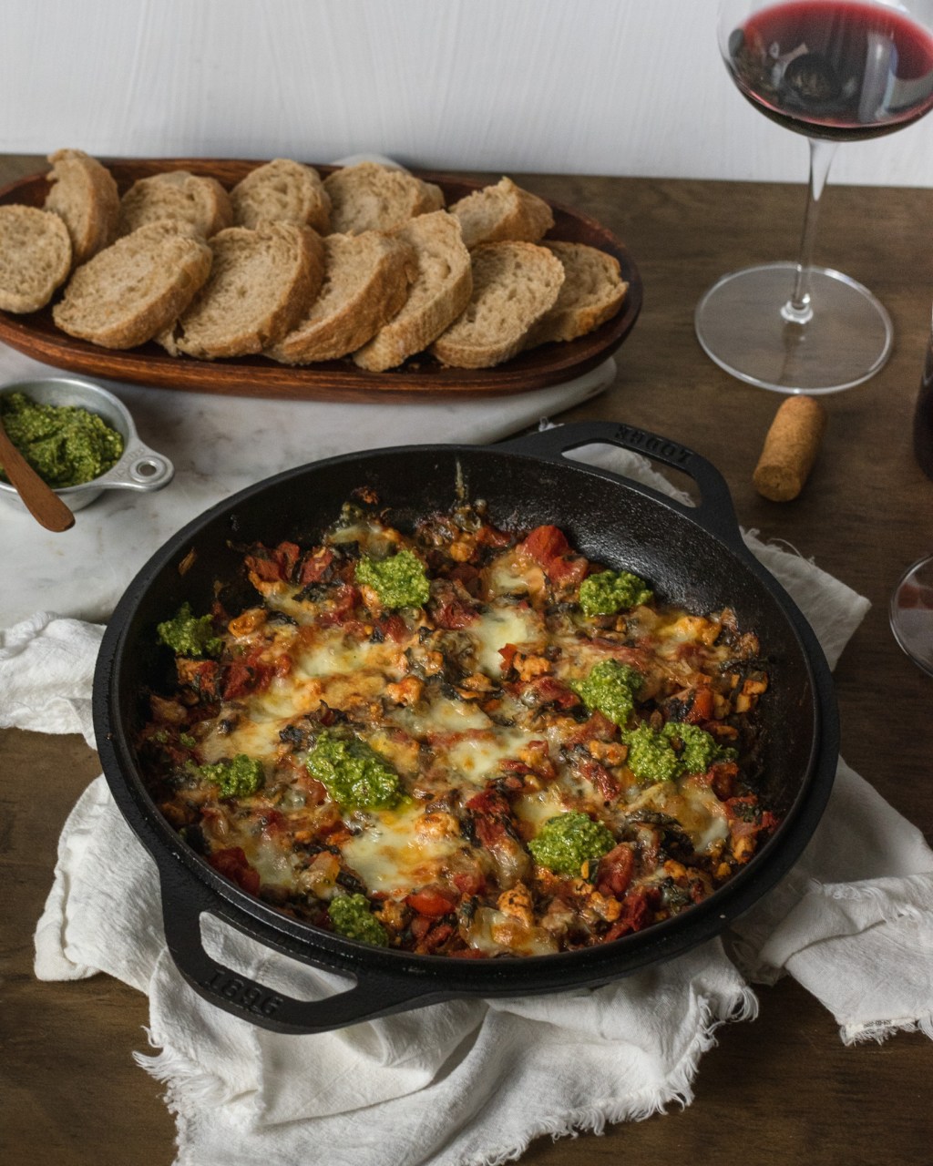 Saute onion + mushrooms with some olive oil, salt + pepper, 2-3 minutes. Add turkey, thyme + garlic powder with a small sprinkle of salt + pepper. Cook until the turkey is just about done, about 3-5 minutes. Pour in tomatoes, kale, oregano + cayenne. Stir then simmer until liquid is reduced. Turn off the heat and turn on your broiler. Dot the fresh mozzarella in the mixture then top with the shredded cheese. Broil for 2-5 minutes until the top is bubbly, golden brown. Drizzle pesto on the top and serve with some sliced bread.