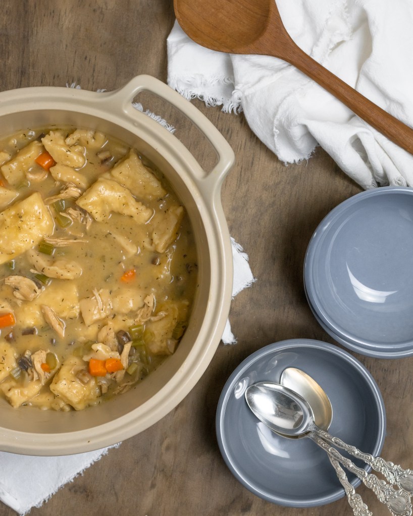 I grew up on my mama’s Chicken + Dumplins and it will forever be one of the MOST COMFORTING meals I can ever eat. One bite and I’m sitting around my parent’s kitchen table with the whole family. My version just has some extra veggies added in.