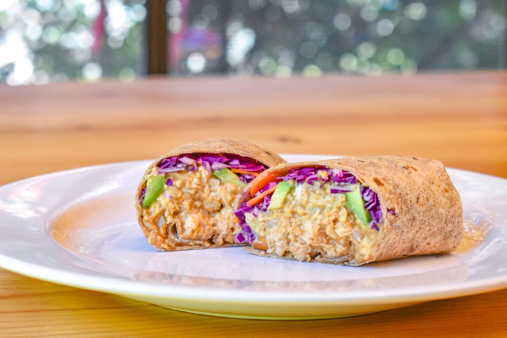 These wraps are the perfect 5 minute, pantry pull lunch for anyone! The Spicy Peanut Sauce is kicked up with fresh ginger and sriracha that is expertly balanced by the peanut butter and a touch of honey. Delicious, nutritious and FAST. A foolproof combination!