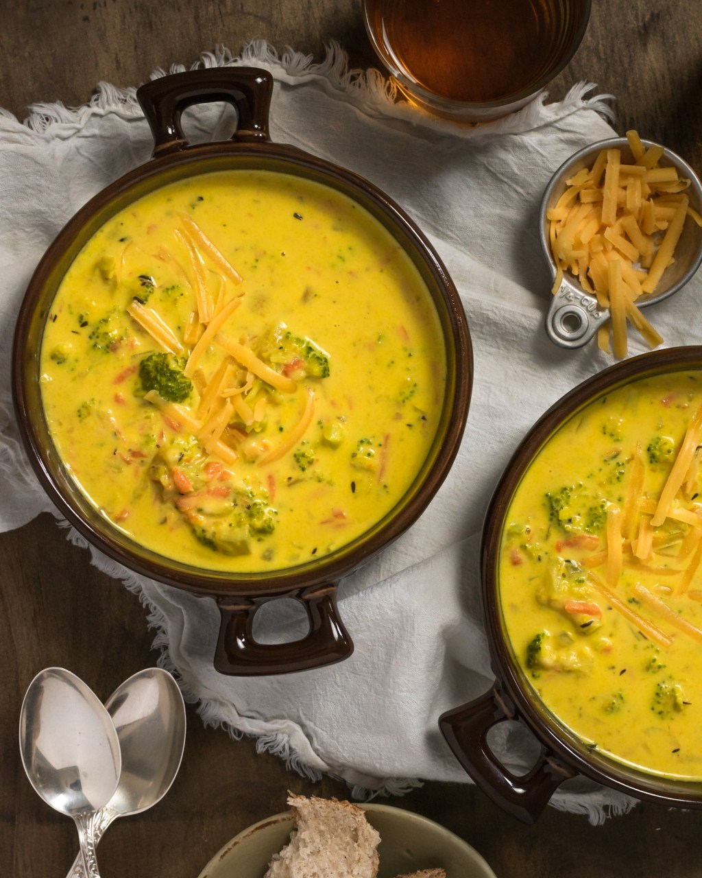 Saute onion, carrots and broccoli stalk in 2T olive oil and a little salt on med-high, cook until soft 2-3 minutes. Add florets (if using frozen don’t add florets yet) and garlic with a little salt, stir then add thyme, turmeric and pepper, stir until fragrant. Sprinkle in flour and combine, cook for 1 minute then add garlic powder, onion powder and mustard. Slowly pour in broth and milk stirring constantly. Bring to a simmer (add florets if using frozen) for 2-3 minutes to thicken a little. Turn off the heat and wait until the soup isn’t super hot (if I can stick the tip of my finger in for 3 seconds without freaking out but its still pretty hot, its ready-if its too hot the cheese will curdle, if it does just throw it in a blender). Add yogurt and 1/3 of the cheddar, stir until combined completely. Add remaining cheddar and parmesan stir until combined.