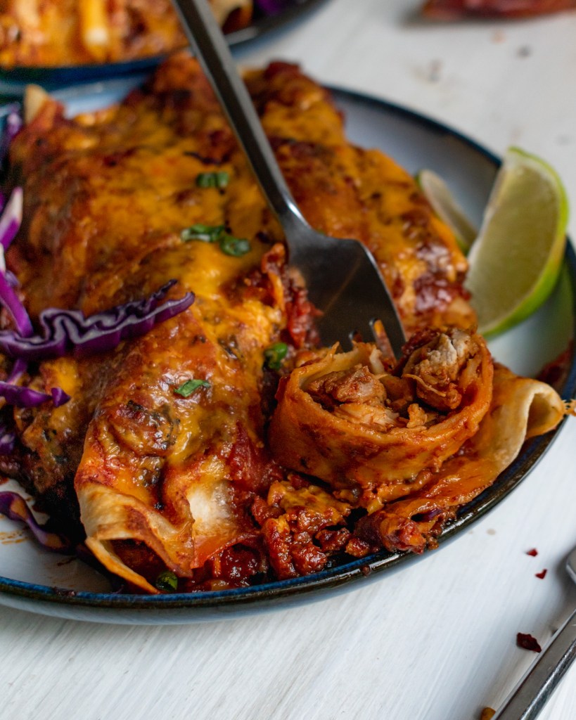 Zingy + bright, these enchiladas HIT THE SPOT. A quick marinade turned enchilada sauce makes efficient use of ingredients while packing in the FLAVOR. A delicious and easy week night meal when thrown together with the EASIEST refried beans, cabbage and radishes. All you’ll need is a margarita.