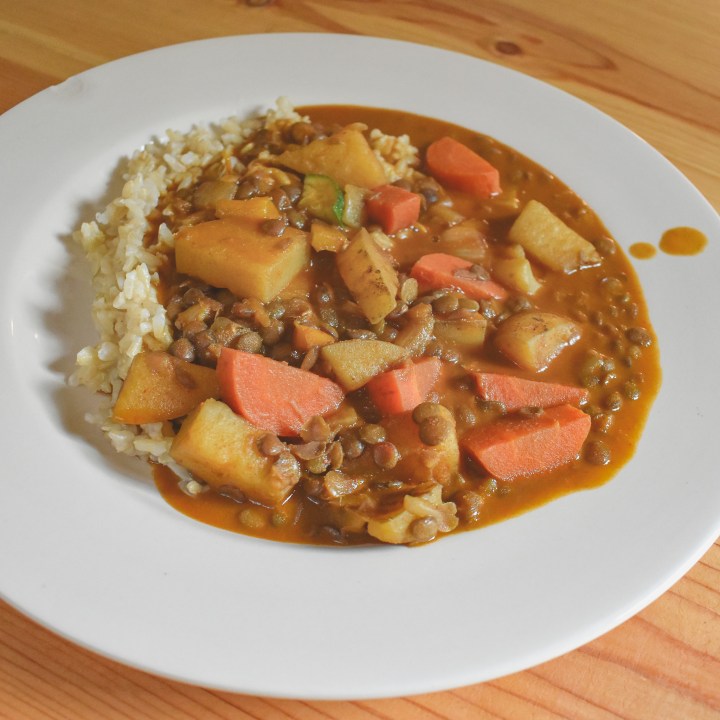 Saute onion, pepper and carrots in coconut oil and a little salt on med-high, cook until soft 2-3 minutes. Add potatoes and garlic, stir then add curry paste, stir until fragrant. Pour in coconut milk then fill the can with water twice, rinsing in any residual milk. Next, add soy sauce and lentils, simmer for 25 minutes then add zucchini, cook for another 10 minutes. Pour in fish sauce and stir right before serving. Serve over rice.