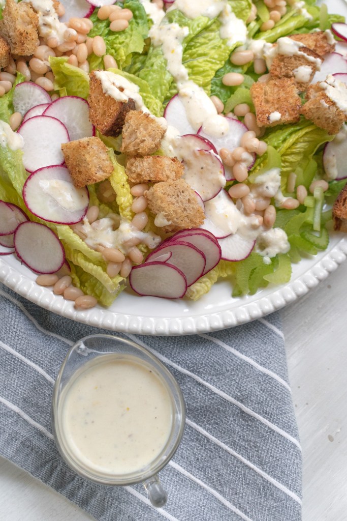 Toss romaine, radishes, celery, white beans, and chives together in a large bowl. Lightly pour dressing around the bowl and toss (I like to try to get the dressing on the walls of the bowl then toss the salad, it allows for a lighter coating of the greens). Add croutons and serve.