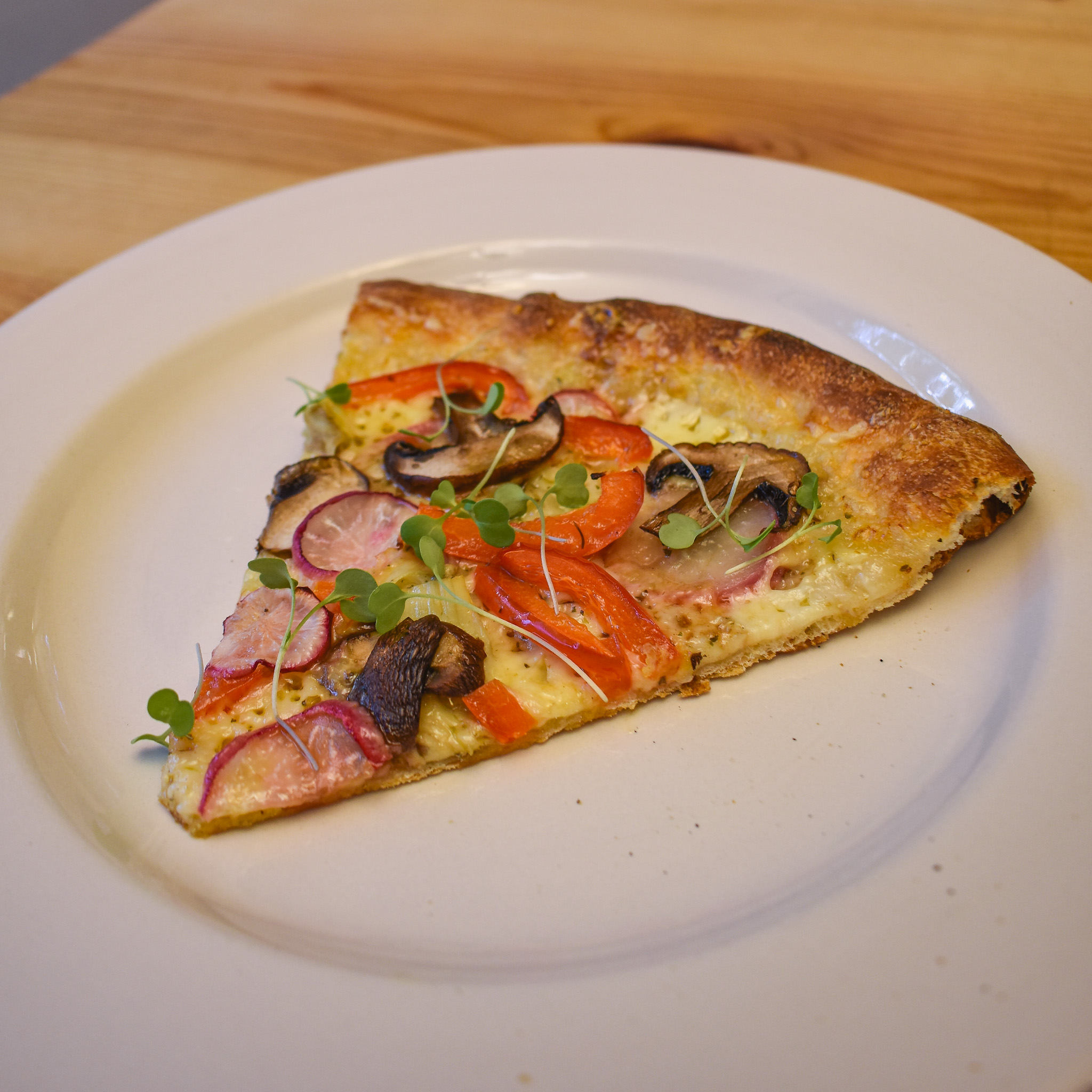 Combine olive oil, garlic and lemon zest with a little salt and pepper and brush/rub it all over the entire pizza. Evenly distribute cheeses then mushrooms, radishes and bell pepper. Bake for 8-10 minutes, until the bottom of the crust is golden brown and the top is completely bubbly. Allow the pizza to cool for a few minutes then drizzle with vinegar reduction and add micros or arugula.