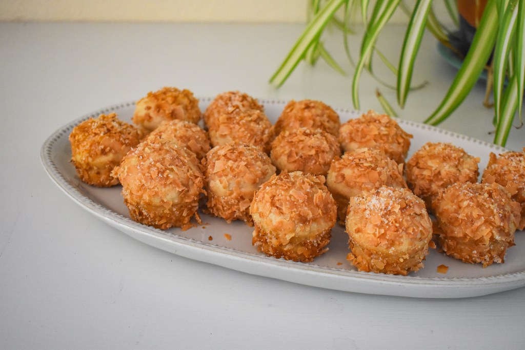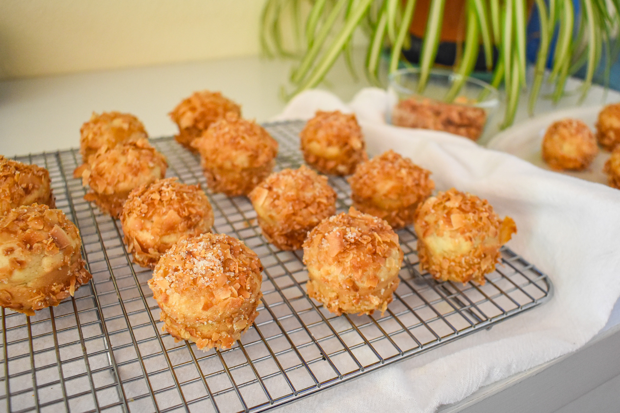 Spread 1c coconut evenly on a sheet pan and bake for 3-4 minutes until golden brown. Pour into a bowl, add 1/4c sugar and toss. Set aside. Bring remaining coconut milk and coconut oil to a boil then reduce to a simmer for 2-3 minutes, whisk occasionally. Pour into a bowl.