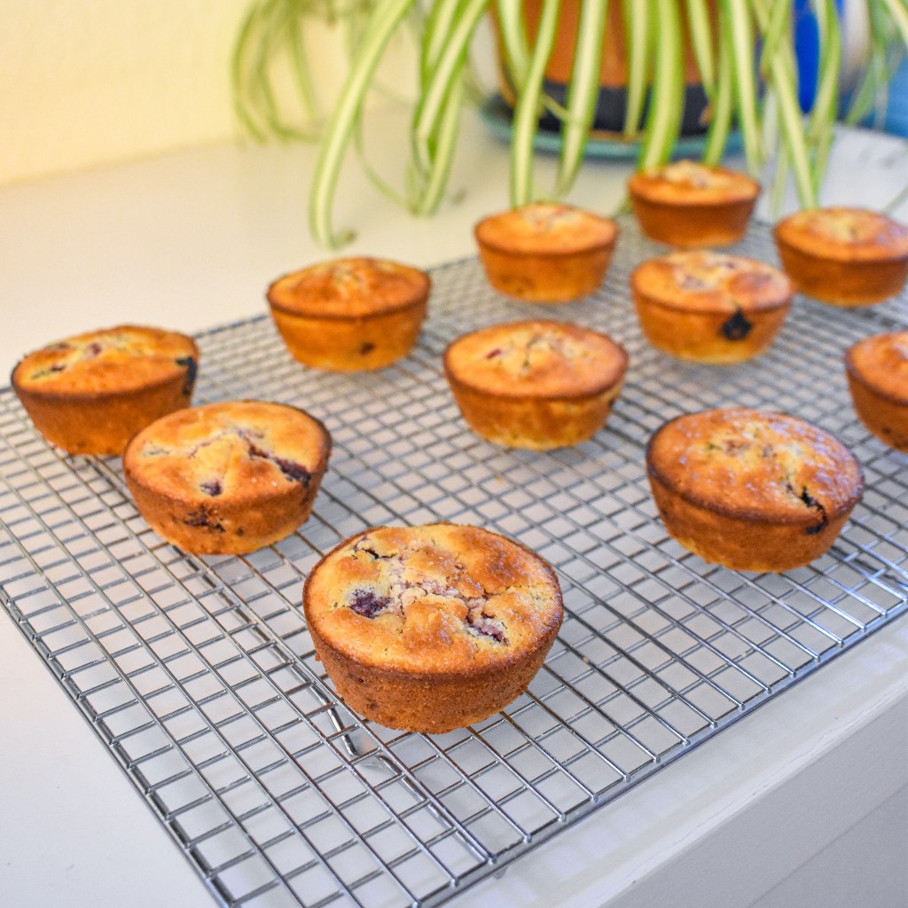 Preheat oven to 425°F. Stir together flour, sugar, oats, chia, baking powder, salt and lemon zest. In a separate bowl, whisk eggs, milk and lemon juice together then pour into dry ingredients. Stir until just incorporated. Scoop into 12 muffins and evenly distribute the cherries and berries into the muffins. Put in the oven then reduce the temperature to 375°F and bake for 15-18 minutes. Allow to cool.