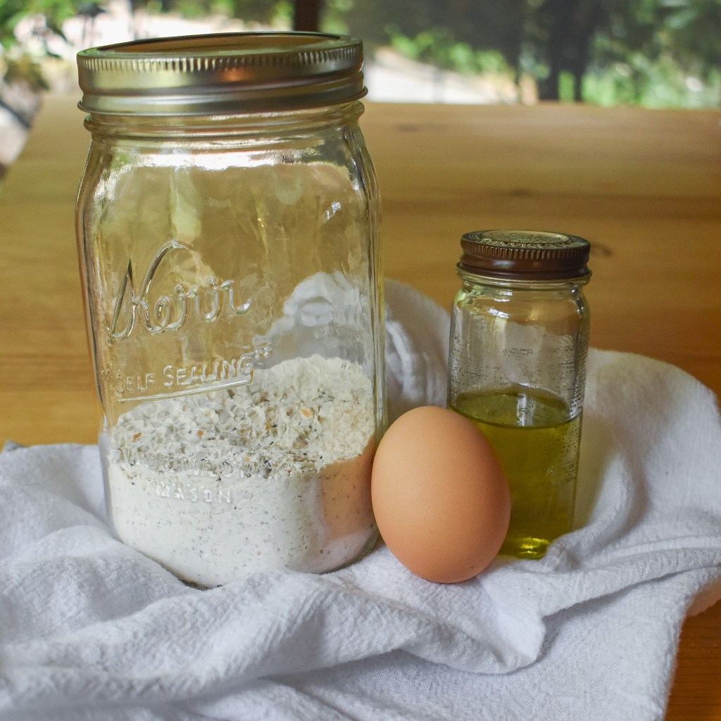 Pour flour, wheat bran, salt, baking powder, baking soda, powdered milk, and seeds in a mason jar, shake to combine. When we’re camping, I store it at this point then add the egg, oil and water at the campsite, put on the lid, shake vigorously, then pour directly on the pan. Top with bananas, peanut butter and maple syrup.