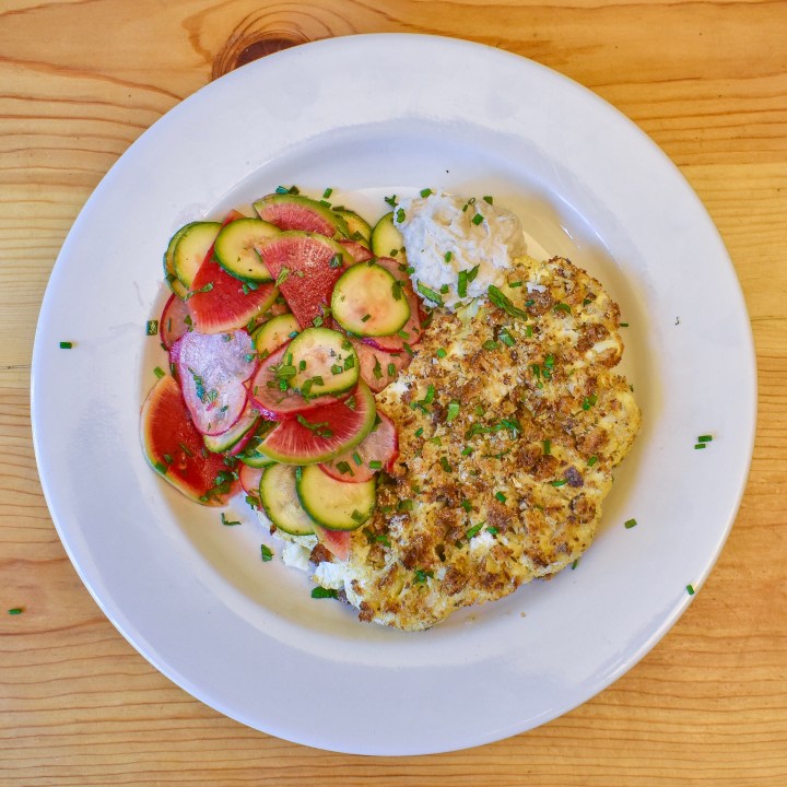 Preheat oven to 375°F. Set out 3 plates, one with flour and a pinch of salt and pepper, the second with the egg, milk, cayenne and a little salt and the third with breadcrumbs, garlic powder thyme and a little salt. Cut 2-3 1″ steaks out of the middle of the cauliflower, use the leftovers another time. Dredge each side of the cauliflower steaks in the flower then egg mixture and breadcrumbs. Make sure to press the breadcrumbs on pretty well. Place the steaks on a sheet pan with a wire rack (sprinkle a little leftover breadcrumbs on the top if you’ve got em) and bake for 20 minutes.