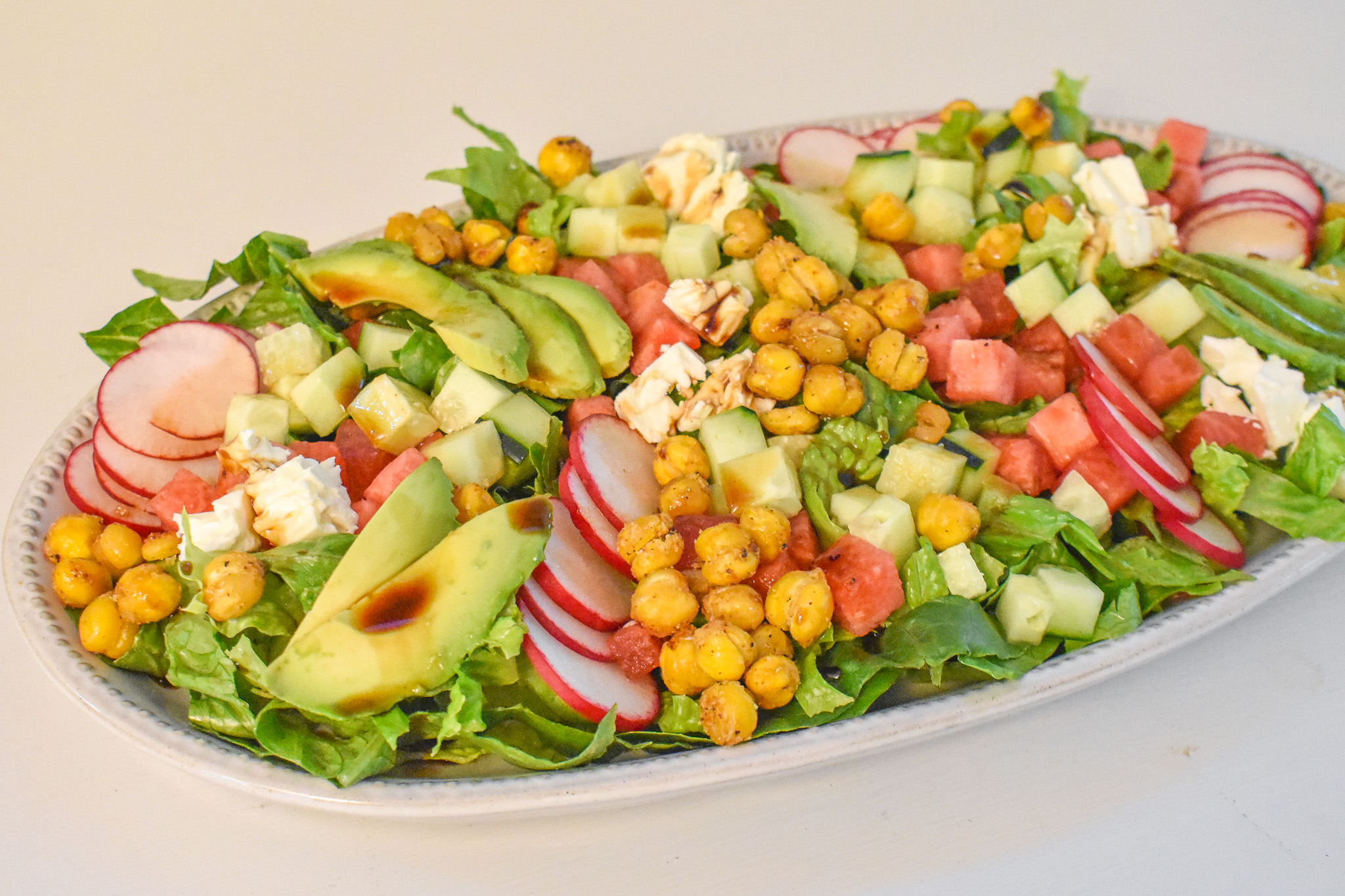 Assemble romaine, radishes, watermelon, cucumber, avocado, feta and chickpeas on a plate or in a bowl then drizzle with cooled balsamic reduction and top with herbs.
