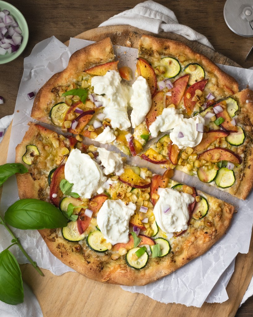 This pizza celebrates the farmer’s market with fresh peaches, zucchini and corn all brought to life with a bright pesto. And because we can’t seem to get enough of it in our house, fresh burrata torn open over the top. ABSOLUTELY DELICIOUS.