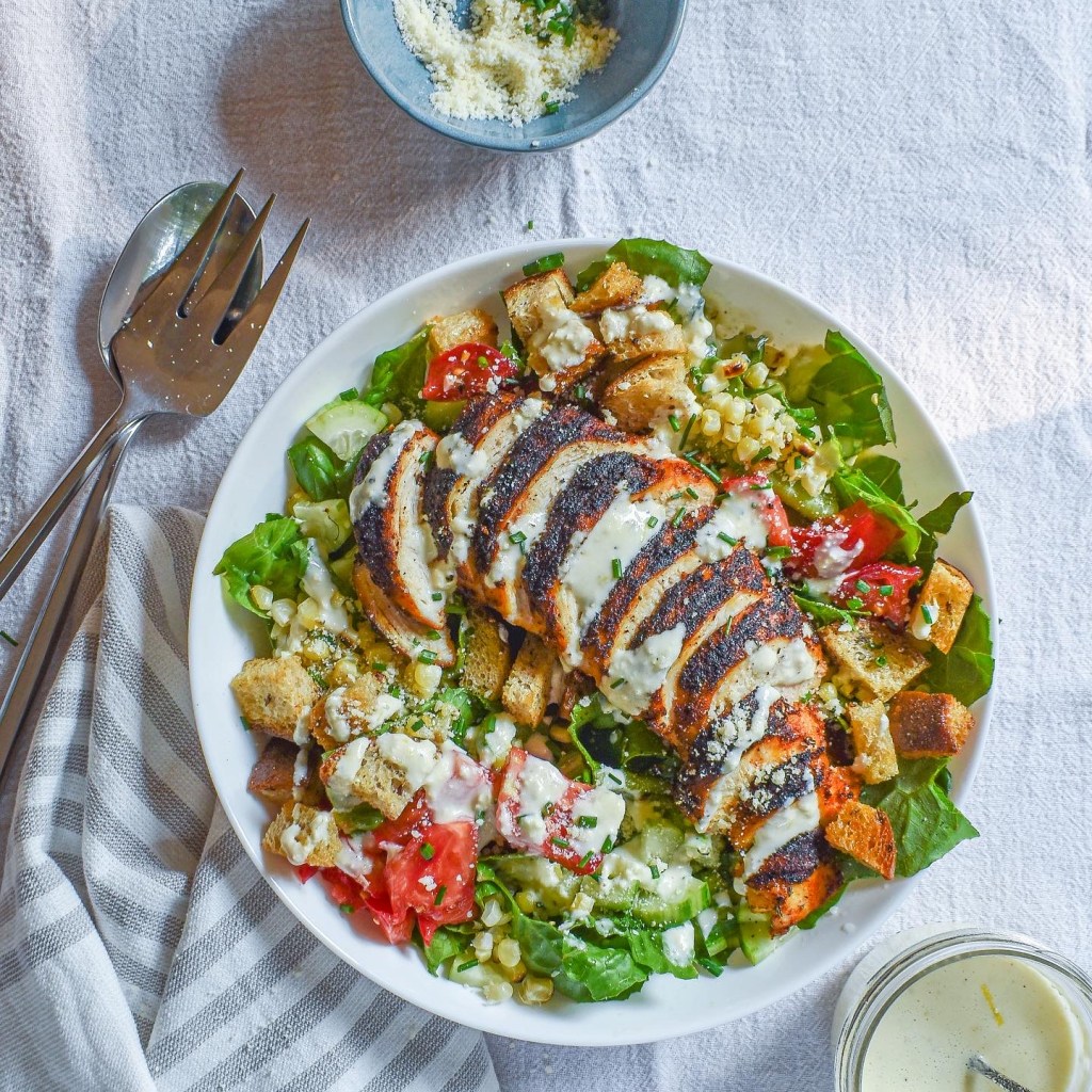 Assemble the salad using the corn, cucumber, tomato, romaine and croutons. Top it with some blackened chicken, chives and extra parmesan. Drizzle with a little dressing and toss.