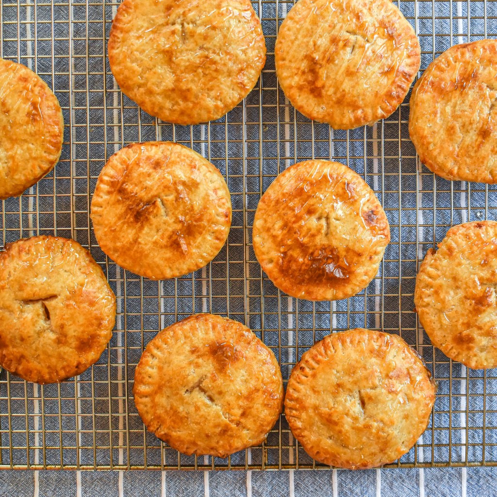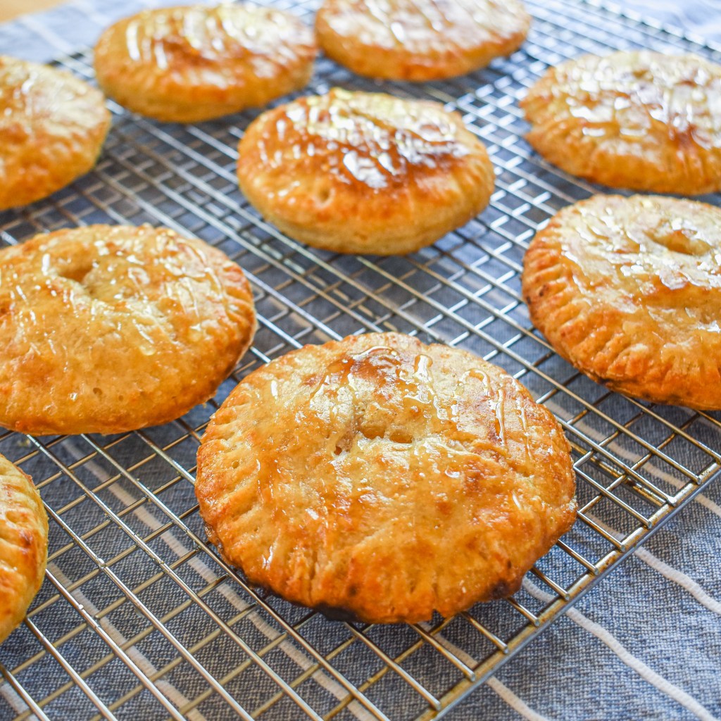 Roll out the dough to about 1/4in and cut out circles (I used a pint class). Stir together the egg and water. Brush one of the circles with the egg wash, put 1T of the apple mixture in the center of the circle, top with another circle and press the edges around with the tines of a fork. Brush with more egg wash, cut a small slit in the top and bake for 8-10 minutes.