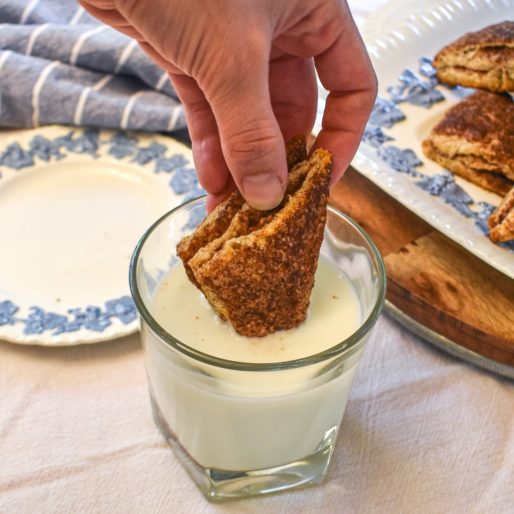 Preheat oven to 375°F. In a large bowl, mix flour, baking powder, salt, 2T sugar, 1/2t cinnamon and nutmeg. Add butter and cut it into the flour mixture with your hands, a pastry cutter or fork. Pour in milk, stir to combine. Flour your surface and roll/press out the dough to about a 6×10″ rectangle. Mix together remaining 2T sugar and 1t cinnamon then sprinkle evenly over the dough. Cut your rectangle into thirds then stack the thirds on top of each other. Roll/press into a 6×10″, trim the edges if you need to, cut into thirds, cut each third in half then cut each on the diagonal to make triangles. Place on a baking sheet and bake for 12 minutes.