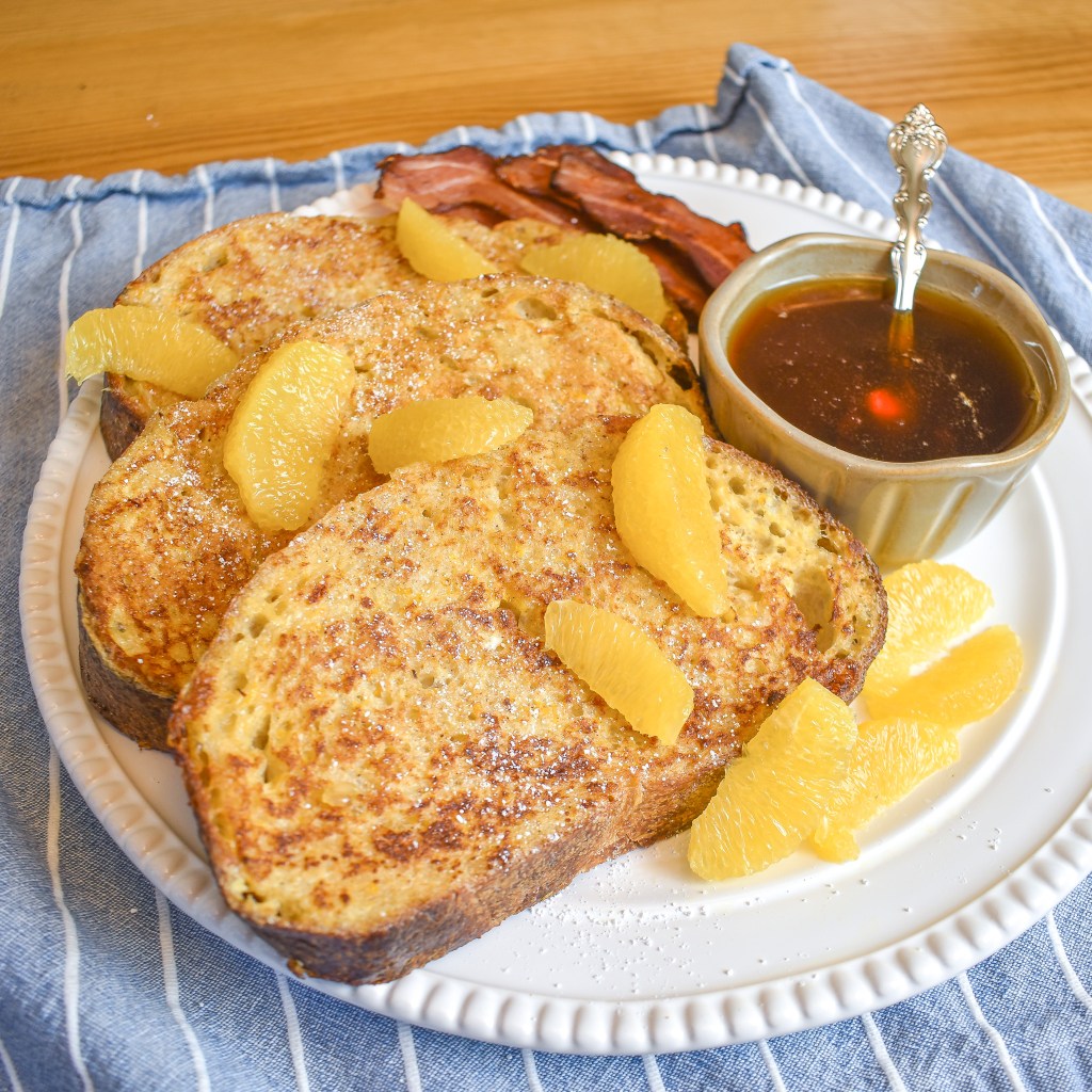 Section the orange and set aside then squeeze the remaining juice in a small pot. Add maple syrup to the pot and bring to a boil and immediately remove from the heat. Pour over french toast and top with orange segments.