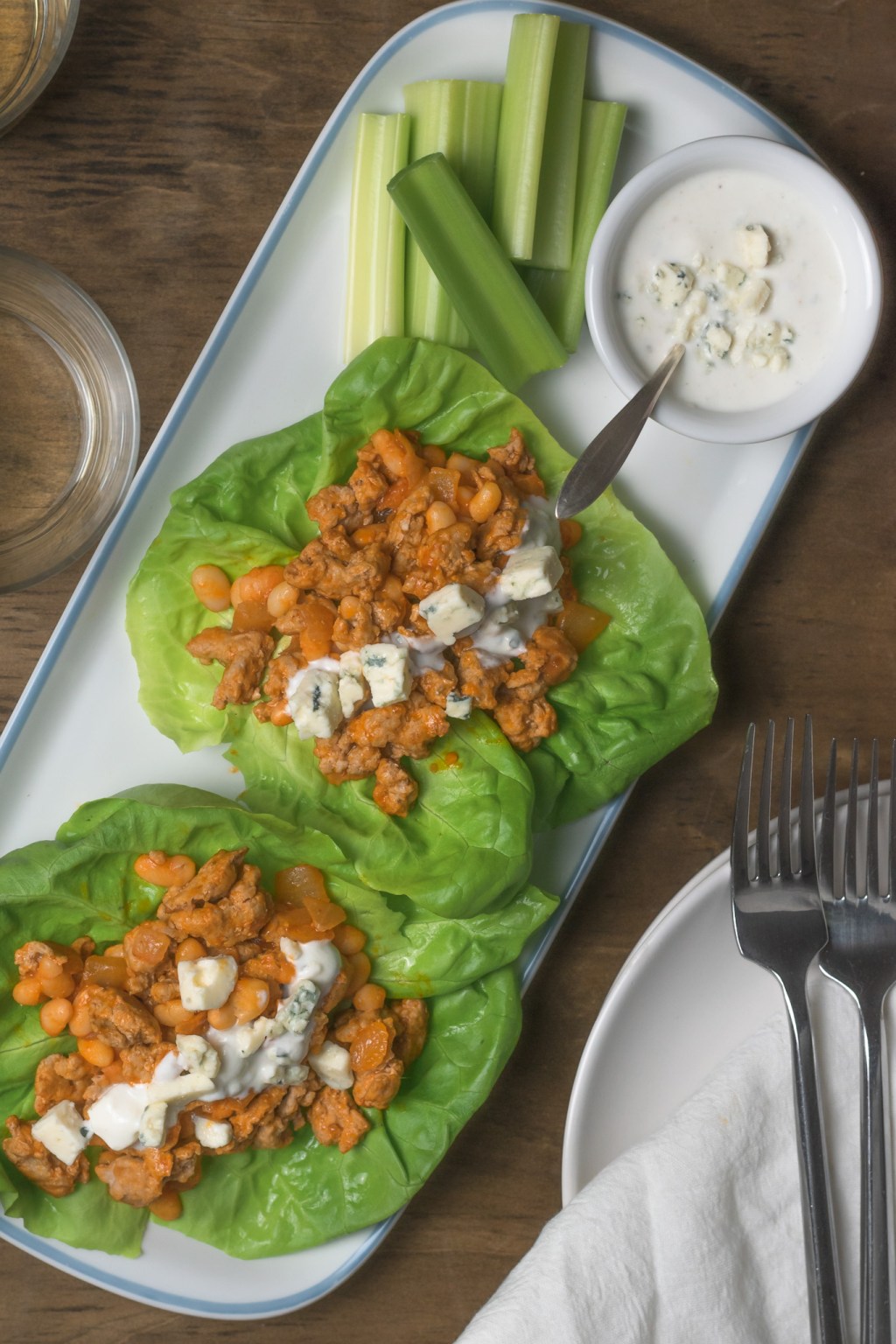 Fill your lettuce leaves then drizzle with some blue cheese-yogurt sauce and top with some crunchy celery slices.