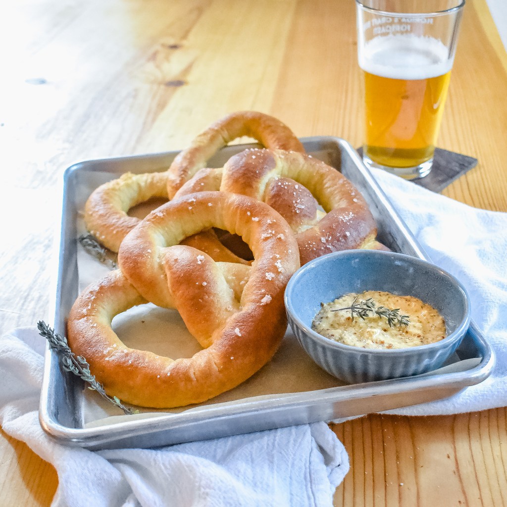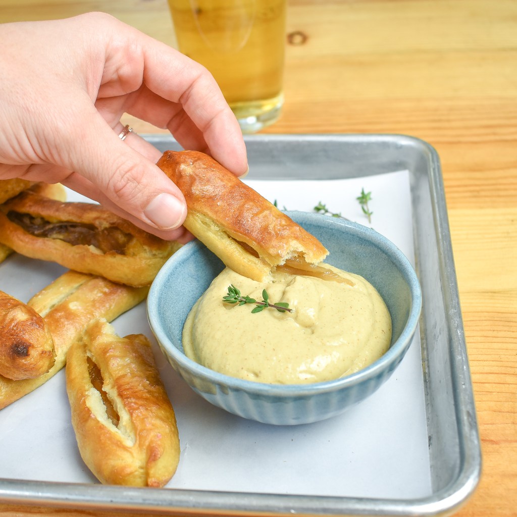 Salted, chewy soft pretzels stuffed with sweet + savory caramelized onions + nutty gruyere cheese. Finished with a dip in some dijon, these pretzels are Happy Hour perfection!