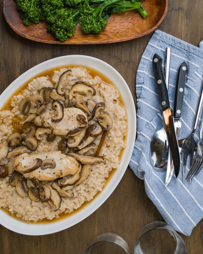 Bring a skillet with a lid to med-high heat. Lightly salt and pepper both sides of the chicken cutlets. Then fry in olive oil for about 2 minutes on each side. (Don’t stress if they aren’t cooked though yet.) Remove from the pan and set aside. Dump in the mushrooms, garlic + thyme and saute for 3-4 minutes til brown, add a little more oil if needed. Deglaze with the marsala wine, scraping any and all bits off the bottom of the pan then pour in the broth. Stir add the chicken back in, pouring in any juices from the plate. Top with the lid and reduce to a simmer for 5 minutes.