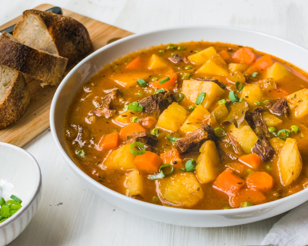 Every year around this time, we ALWAYS end up with some seasonal beer in our fridge, usually a porter or stout that just gets pushed further to the back of the fridge as each day gets a little warmer. Making a luscious beef stew is my go to way to use it up while also winning MAJOR husband points! Melt in your mouth beef with tender potatoes + carrots simmered in a silky savory thyme + cumin infused broth. Its so warming + satisfying. You’re gonna love it!
