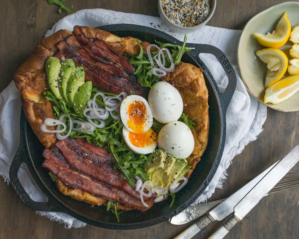 Toss the arugula in the juice of half of the lemon then arrange it on top of the dutch baby with the bacon, avocado + shallot. Garnish with everything bagel seasoning + an extra squeeze of lemon.
