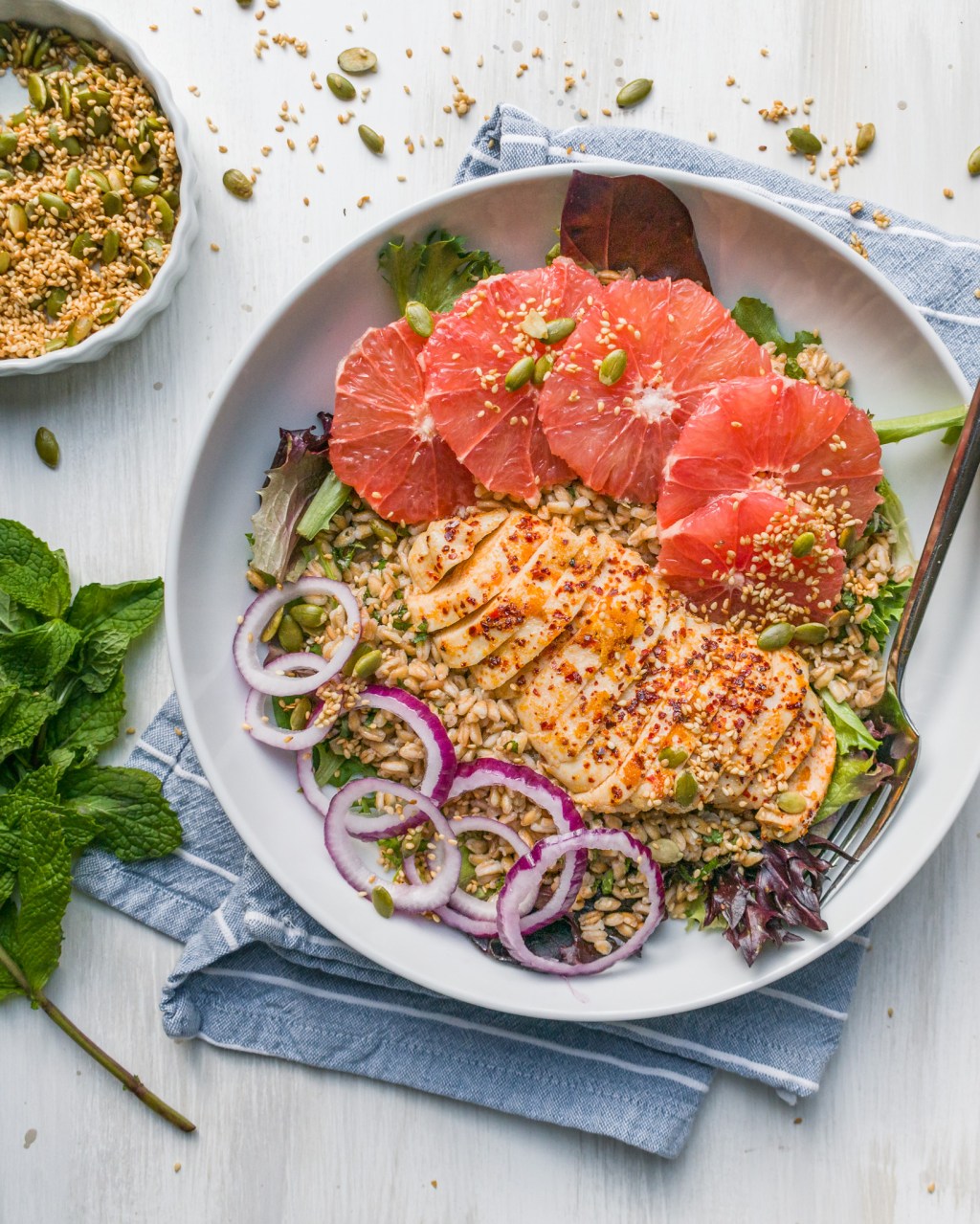 Succulent chicken seasoned with mild aleppo pepper + lemon zest paired with juicy grapefruit slices + crunchy seeds over nutty farro + fresh greens tossed in a super easy tahini dressing + a little mint. Perfectly balanced, so delicious. Great for lunch, dinner + easily meal prepped too!