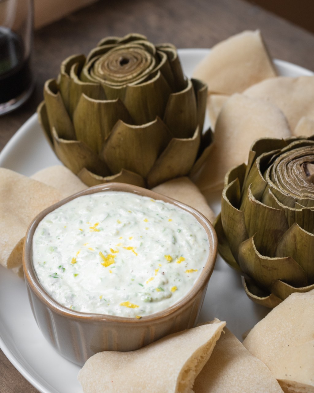 Put yogurt, feta, lemon zest, a little salt + pepper in a food processor and blend until smooth. Add green onions then pulse until desired texture.