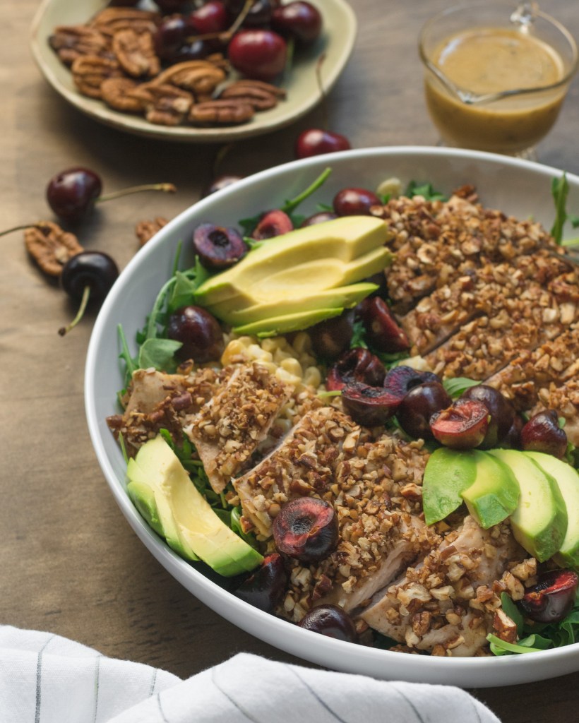 A light + refreshing spring and summer salad that is oh so satisfying. Sweet bursts of cherry + corn balanced out with a tangy honey mustard + crunchy pecan crusted baked chicken.