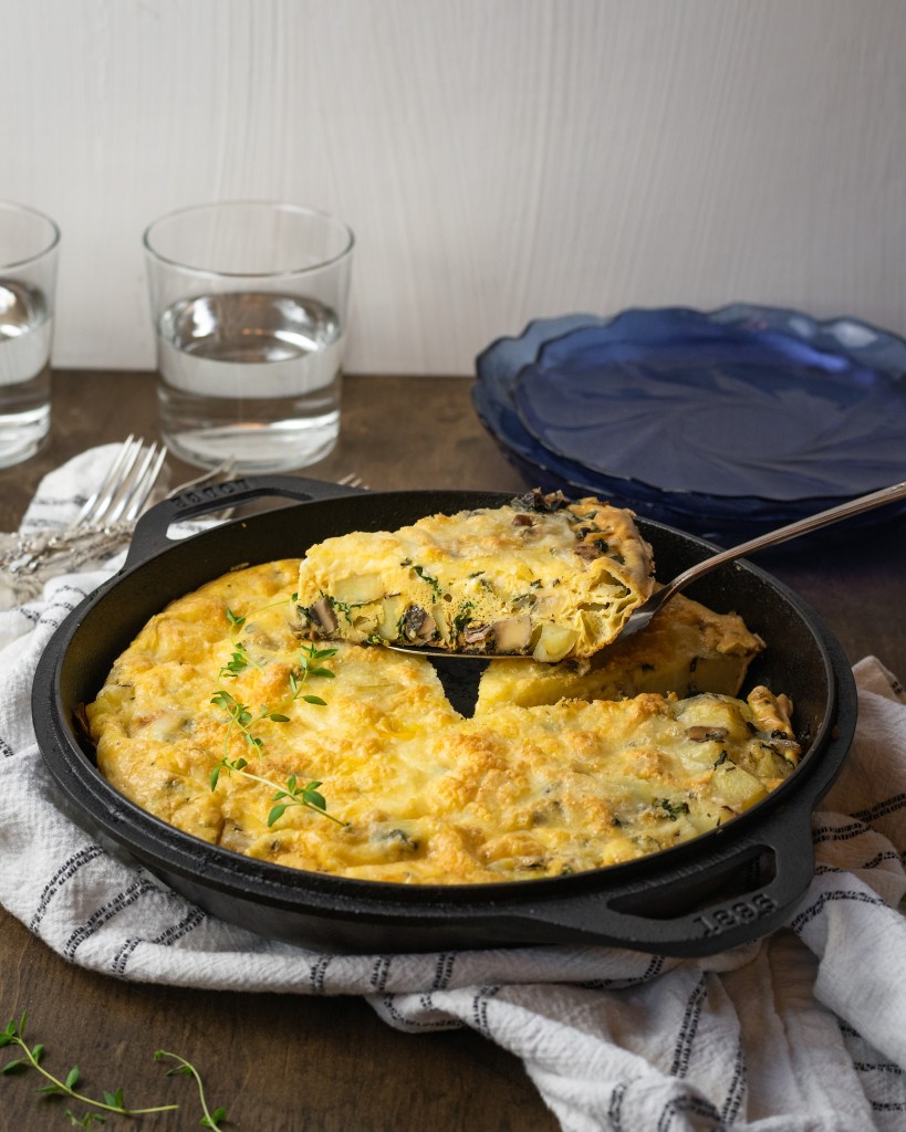 In an oven-proof 10-12″ skillet, saute shallot + mushrooms in butter/olive oil. Cook for 2-3 minutes. Add thyme, red pepper flakes + kale with a little pinch of salt + pepper, allow to cook for 1-2 minutes then dump in the potatoes, stir occasionally for another 2-3 minutes. Top the veggies with cheese then pour eggs over it all. Bake for 25-30 minutes then let it cool for at least 10 minutes before serving.