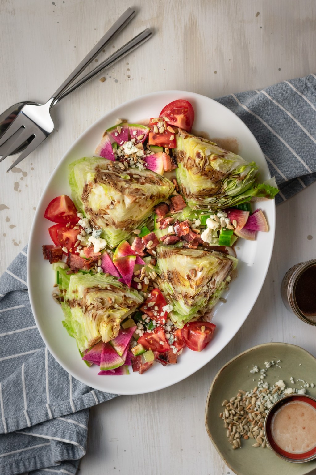 Cool down with this crisp, hydrating iceberg salad loaded with all the yummy toppings, drizzled with a light + bright balsamic jam vinaigrette. So easy + refreshing, you’ll be making it every week!