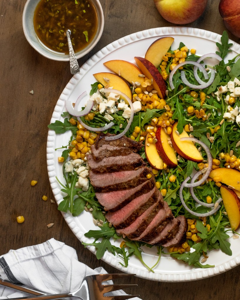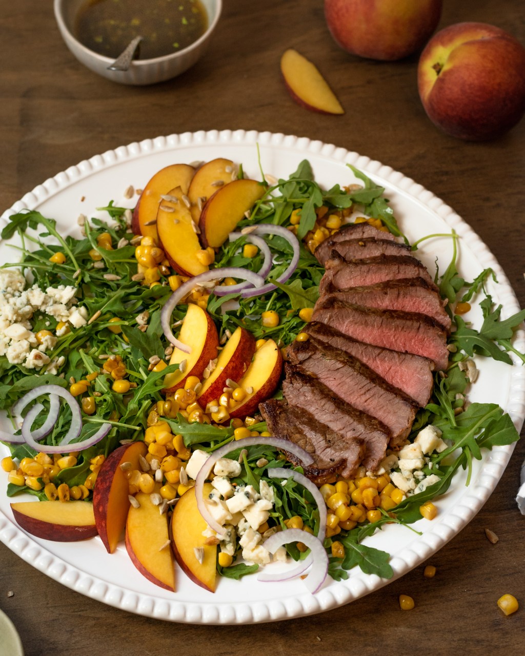 Spread some arugula out on a large plate or bowl. Arrange peach slices, red onion, sunflower seeds, gorgonzola + corn to your liking. Slice up the steak, place on top of the salad then finish with dressing.