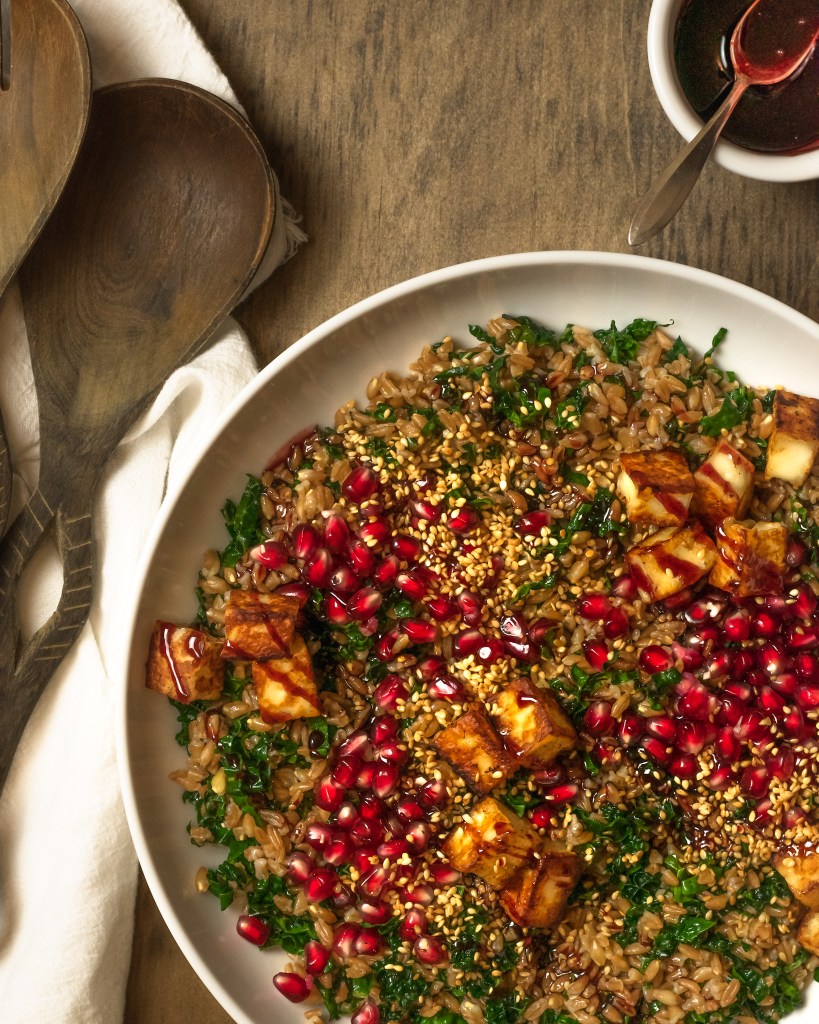 Toss kale and farro together then top with halloumi, sesame seeds and pomegranate seeds. Drizzle with pomegranate reduction.
