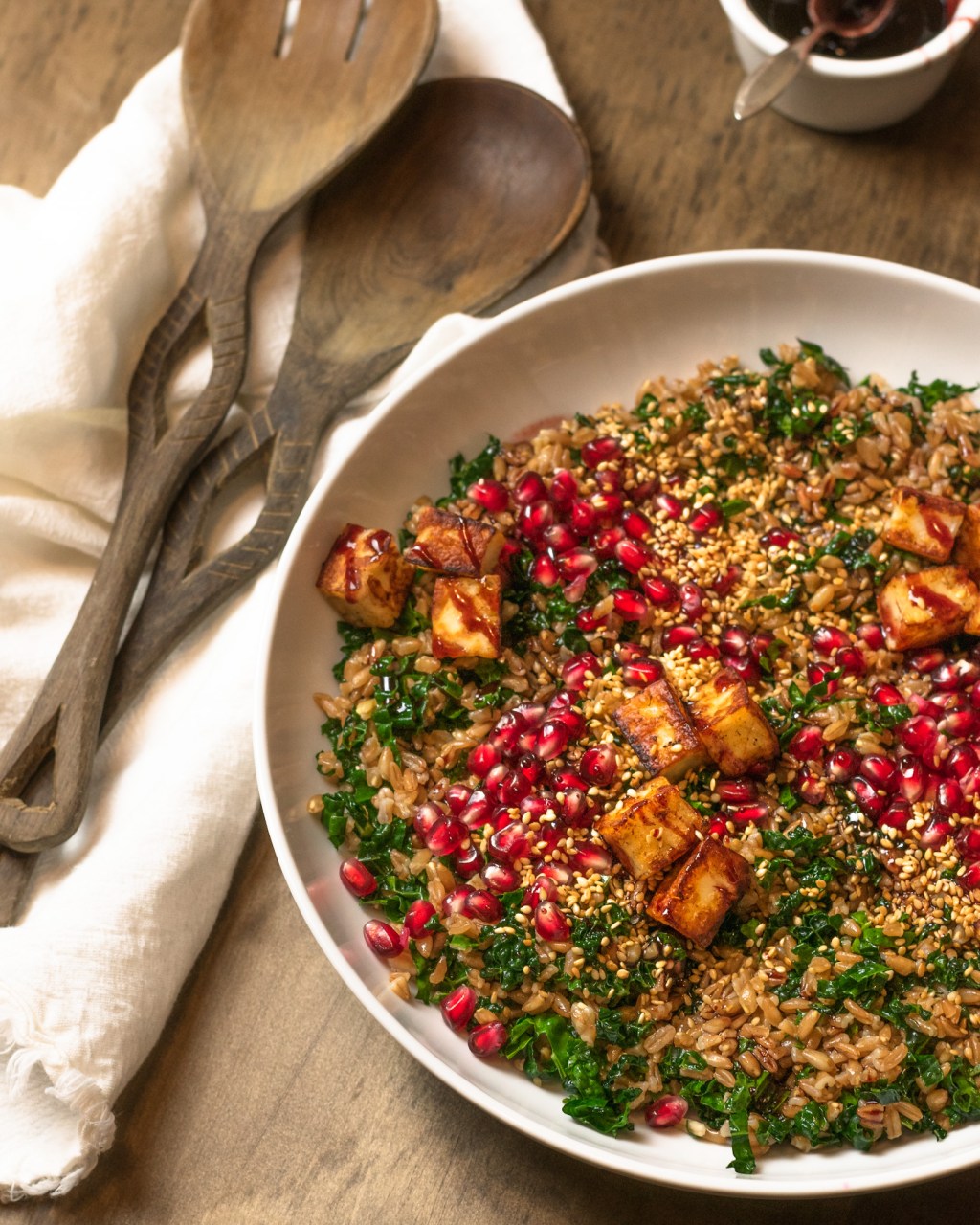 This cozy winter salad is hearty nutritious and packed with flavor! Gorgeous winter kale and nutty farro drizzled with a spiced pomegranate reduction that could make just about anything taste incredible! Then top it off with crispy halloumi croutons and all the sesame and pomegranate seeds. This one is a total winner!