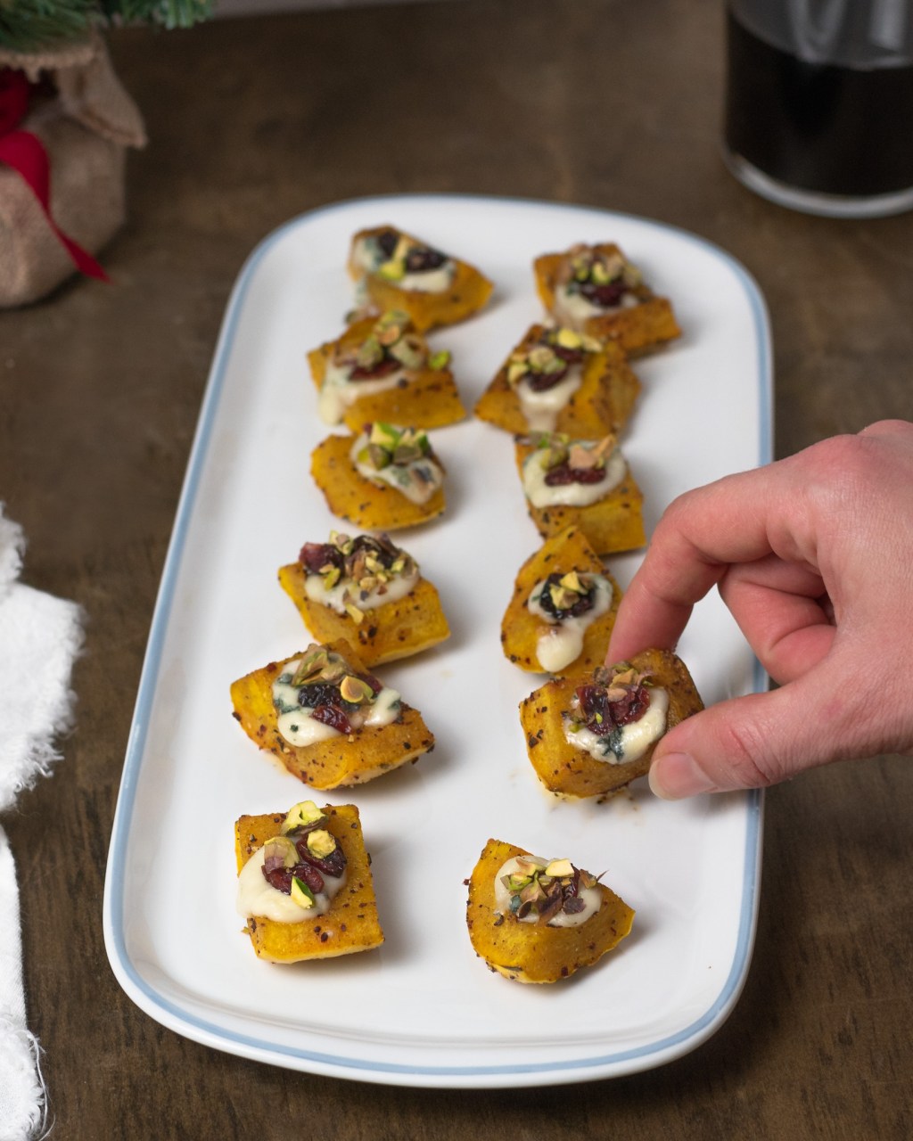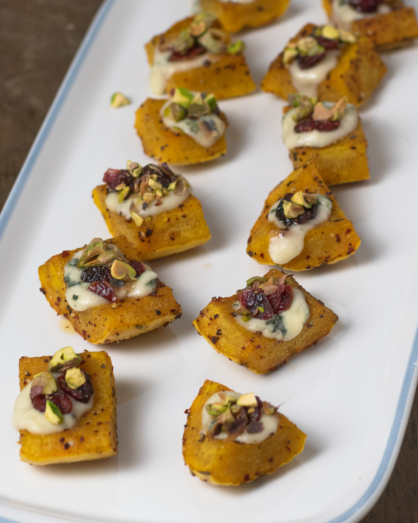 Tender spiced delicata topped with gooey melted blue cheese and tart dried cranberries, finished with crunchy chopped pistachios. This elegant appetizer is perfect for any holiday party and comes together in no time. Your guest are gonna rave!