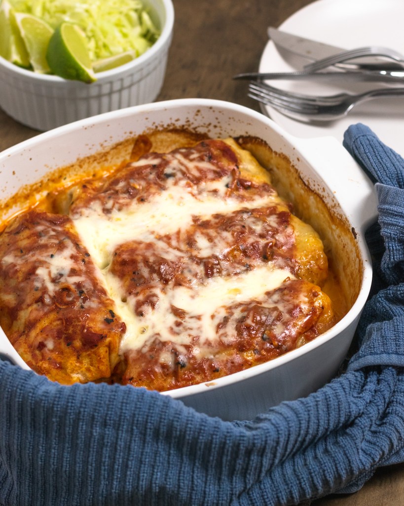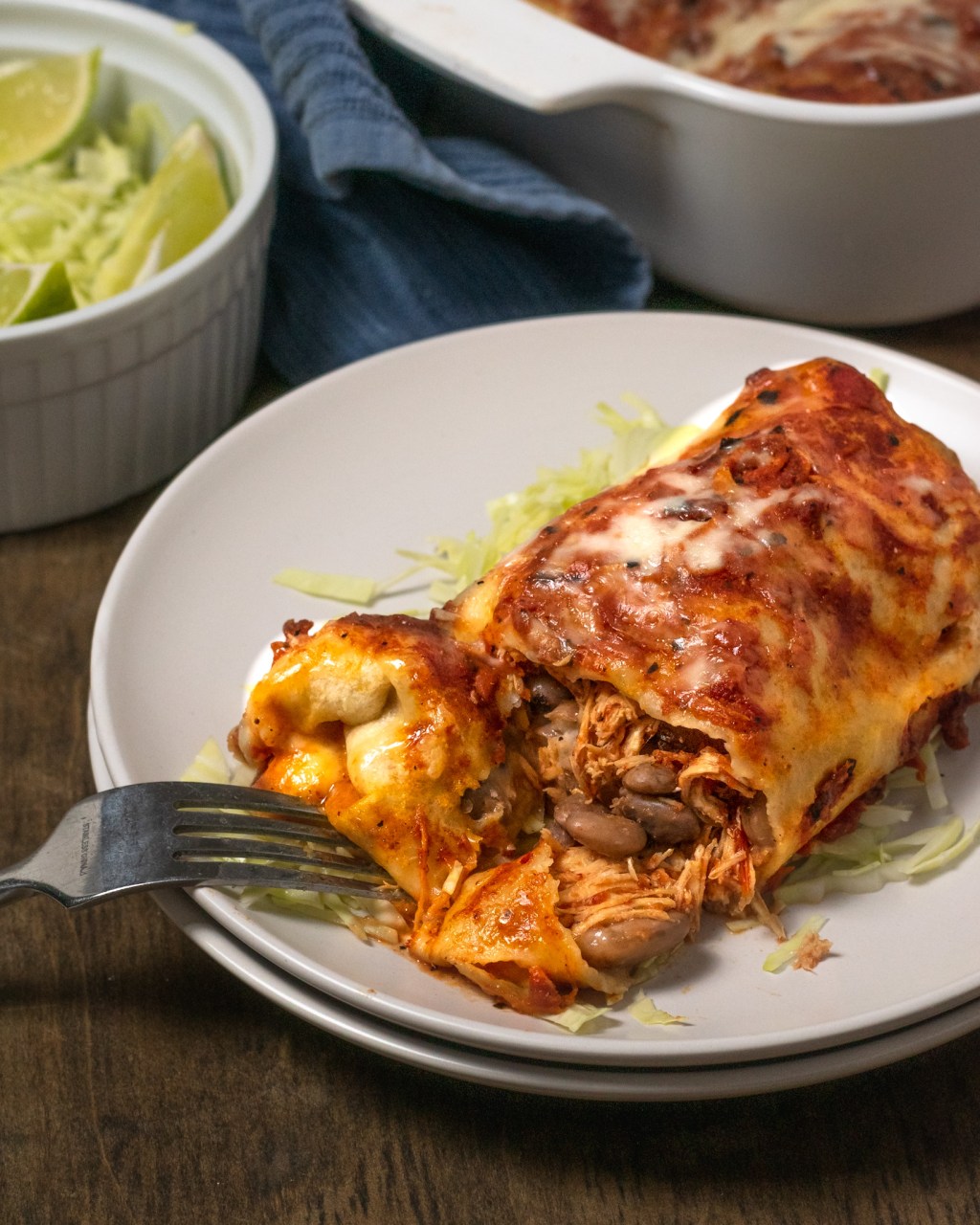 Pour a little leftover sauce in the bottom of an 8×8 baking dish. Stir together the shredded chicken and pinto beans. Scoop about 1/4 of the chicken and beans into a tortilla, top with a little cheese then roll it up like a burrito. Place seam side down in the baking dish. Repeat for the remaining tortillas then pour the rest of the sauce on top of the burritos then top with remaining cheese. Cover with a lid or foil then bake for 20 minutes. If you want a crispy top then remove the lid for an extra couple of minutes.