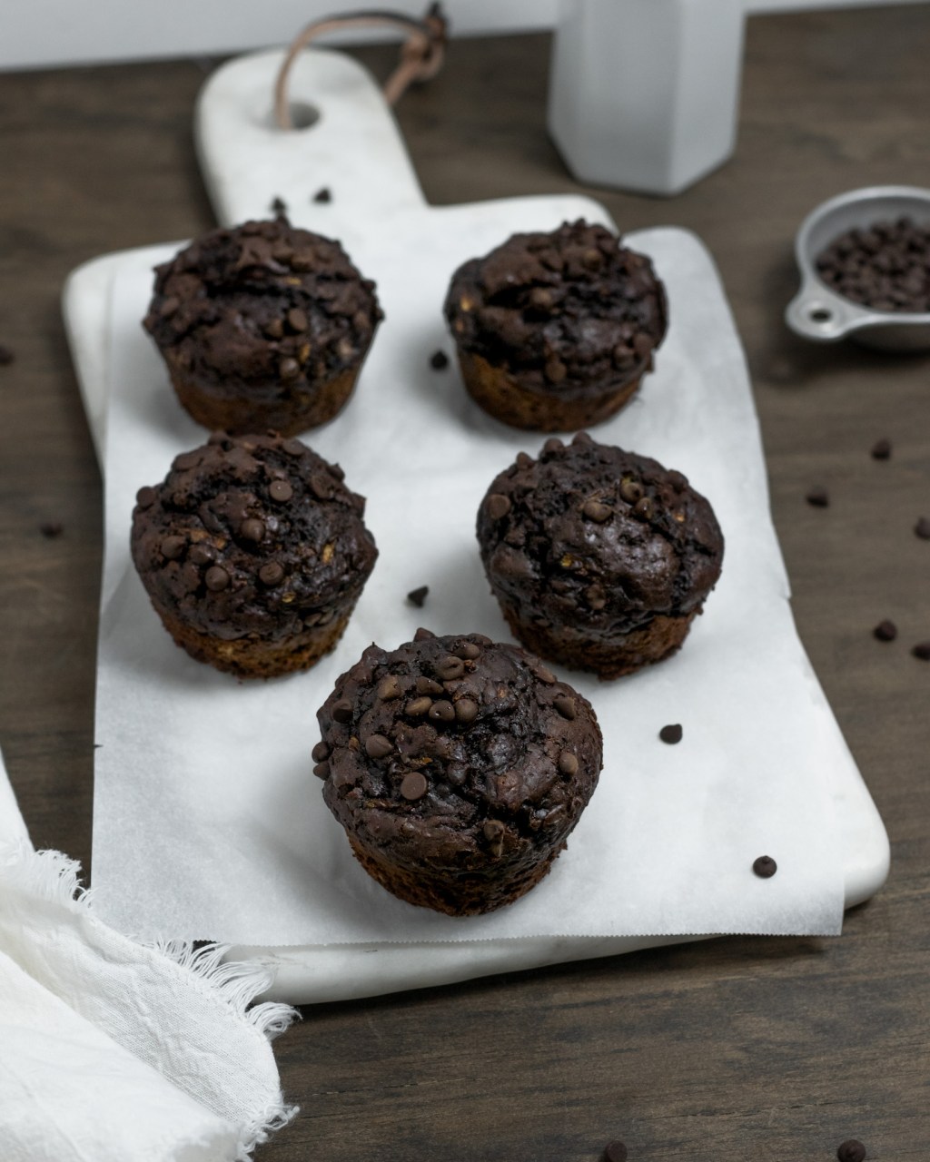 Double chocolatey goodness! A rich cocoa batter with mini chocolate chips and shredded zucchini folded in to help keep it super moist and delicious. These muffins are such a treat!