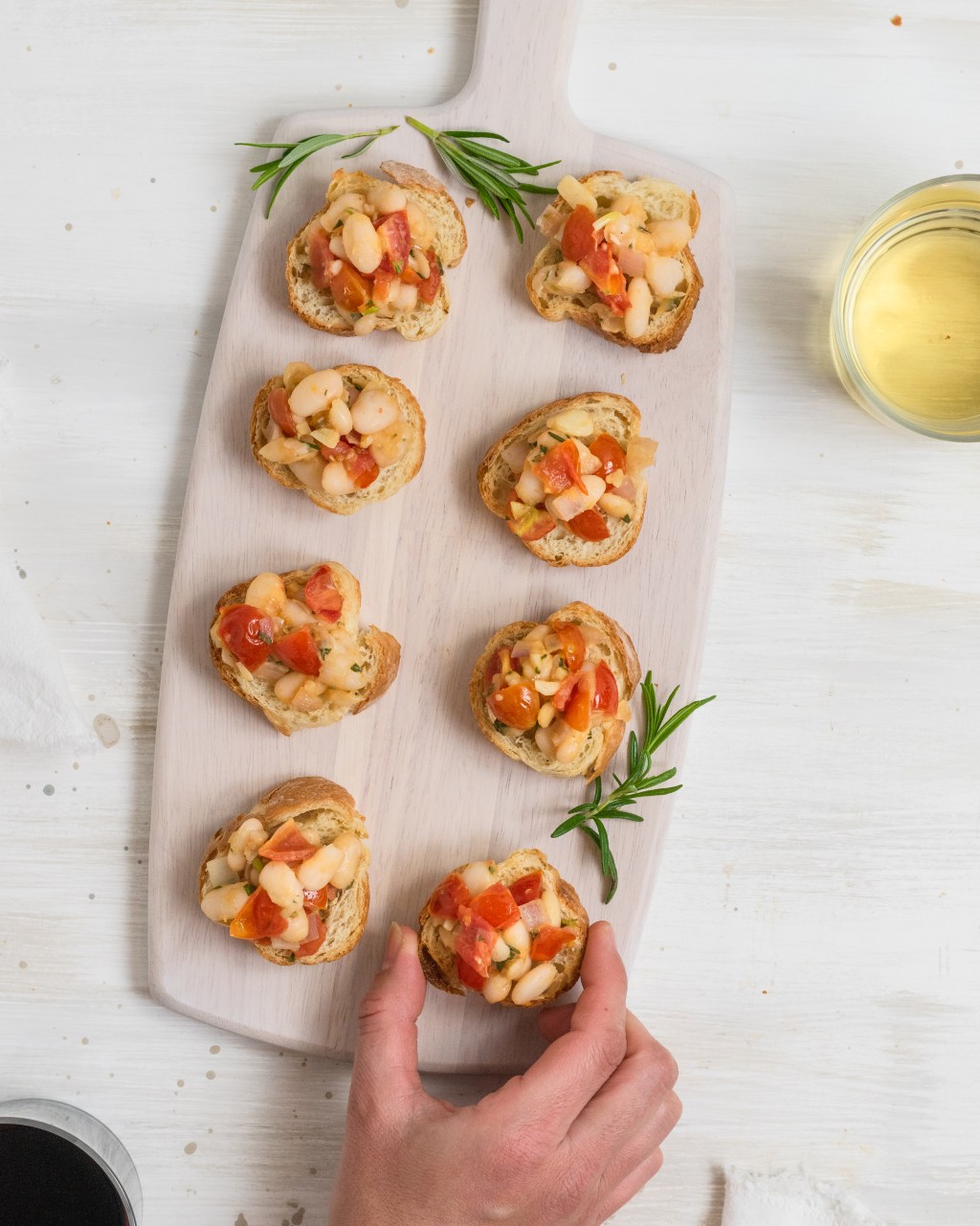 An incredibly flavorful appetizer that comes together in just minutes! Sauteed shallot and garlic with fresh rosemary, creamy white beans and juicy tomatoes, served warm over toasted baguette slices. Simple, delicious and healthy! You’re going to love these.