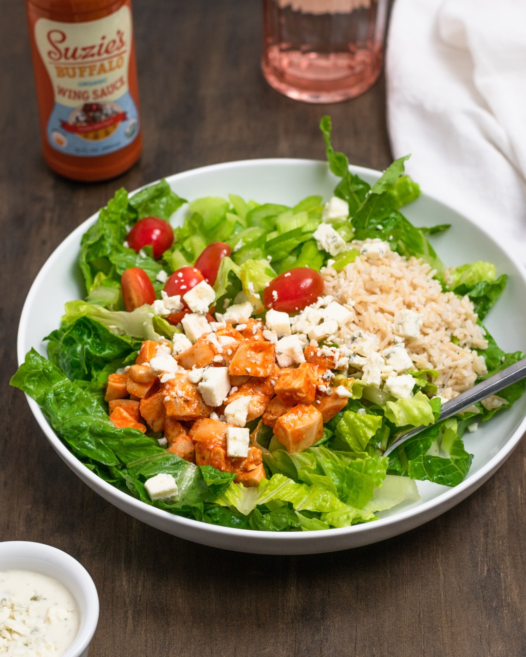 In 2 big dinner bowls, place about a 1c scoop of rice in each. Top with the romaine, celery, tomatoes, cheese and buffalo chicken. Drizzle on some ranch or blue cheese dressing.