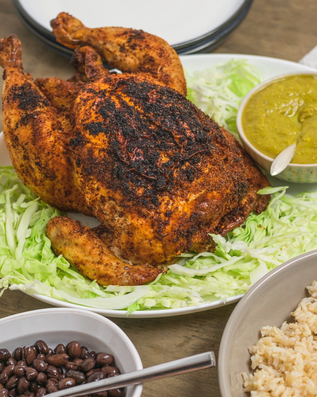 Carve up the chicken and serve with the green chili sauce.