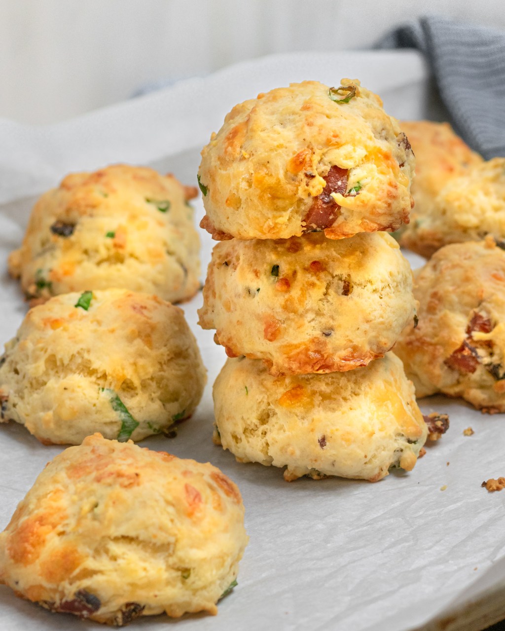 With Father’s Day coming up its time to share one of my dad’s recipe requests and this one is beyond brilliant. Crispy bacon and gooey gouda with a little bite from green onions wrapped up in a buttery fluffy quick and easy biscuit! These are absolutely to die for!