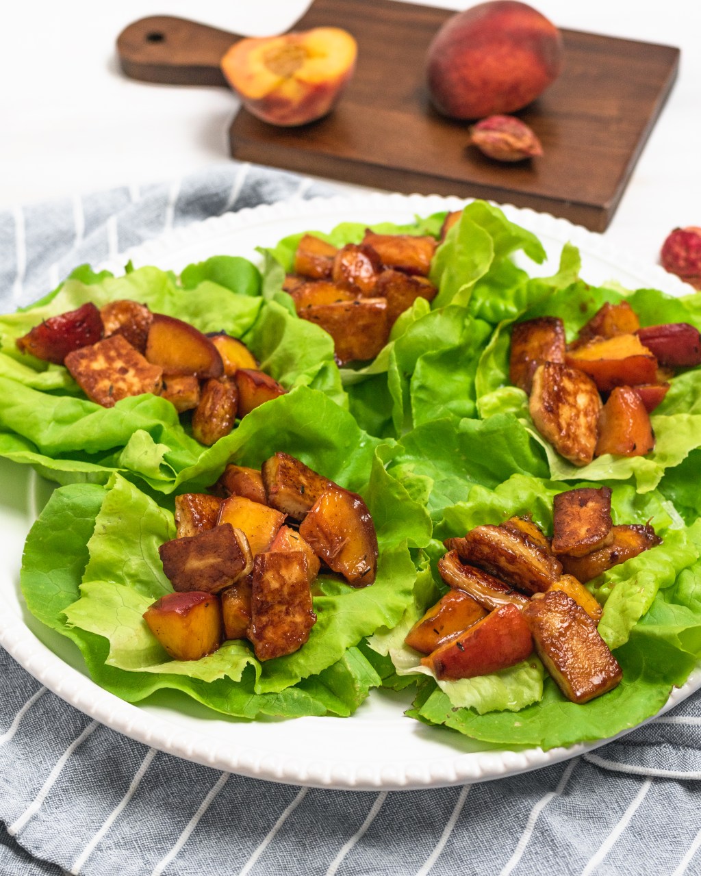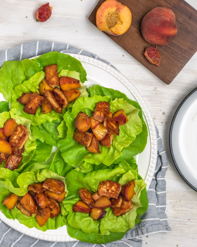 Your new salty sweet summertime favorite! Sauteed peaches and halloumi tossed with a balsamic maple sauce then wrapped up in a crisp lettuce leaf. Simple, flavorful and so fresh. You are going to absolutely love these!