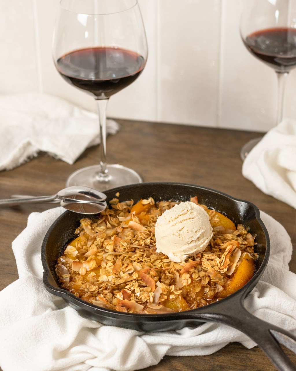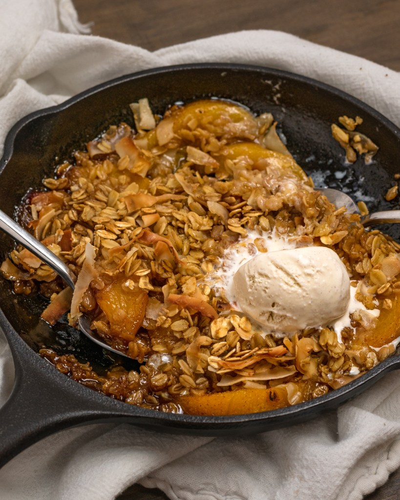 Perfect for a summertime date night at home. Soft juicy peaches, baked with maple, cinnamon and allspice topped with buttery, crispy oats and coconut. All you need is a little scoop of vanilla ice cream and you are in PARADISE!