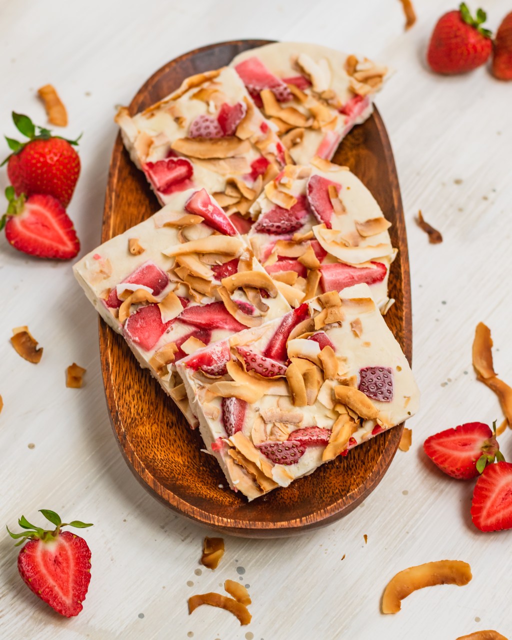 This protein packed frozen treat is the perfect way to cool down this summer! Sweet maple yogurt spread out on a baking sheet topped with fresh strawberries, toasted coconut and a touch of flakey sea salt then frozen solid. Ooo its so good!