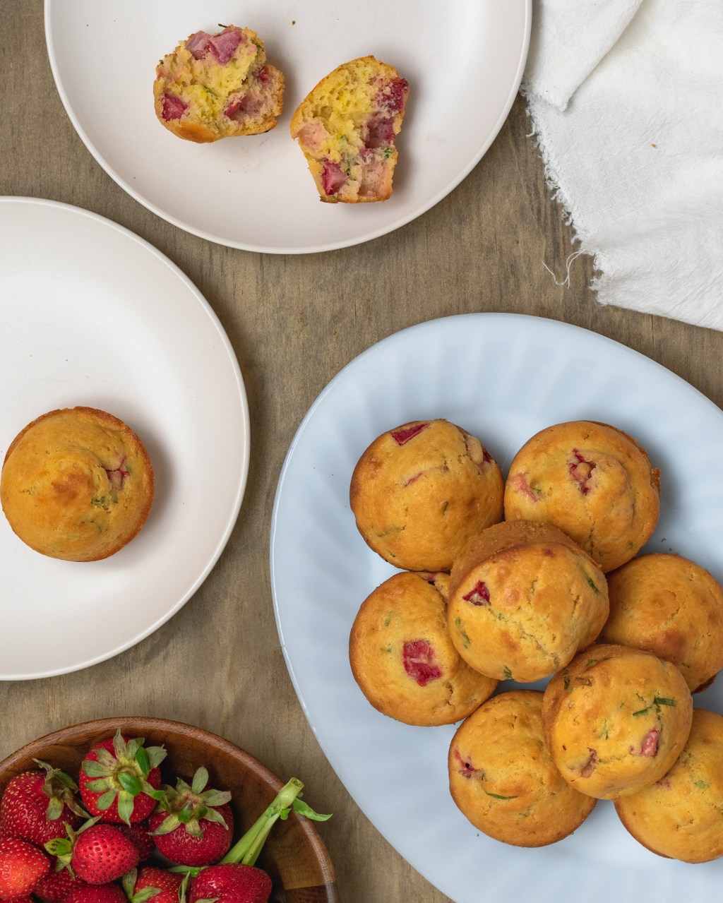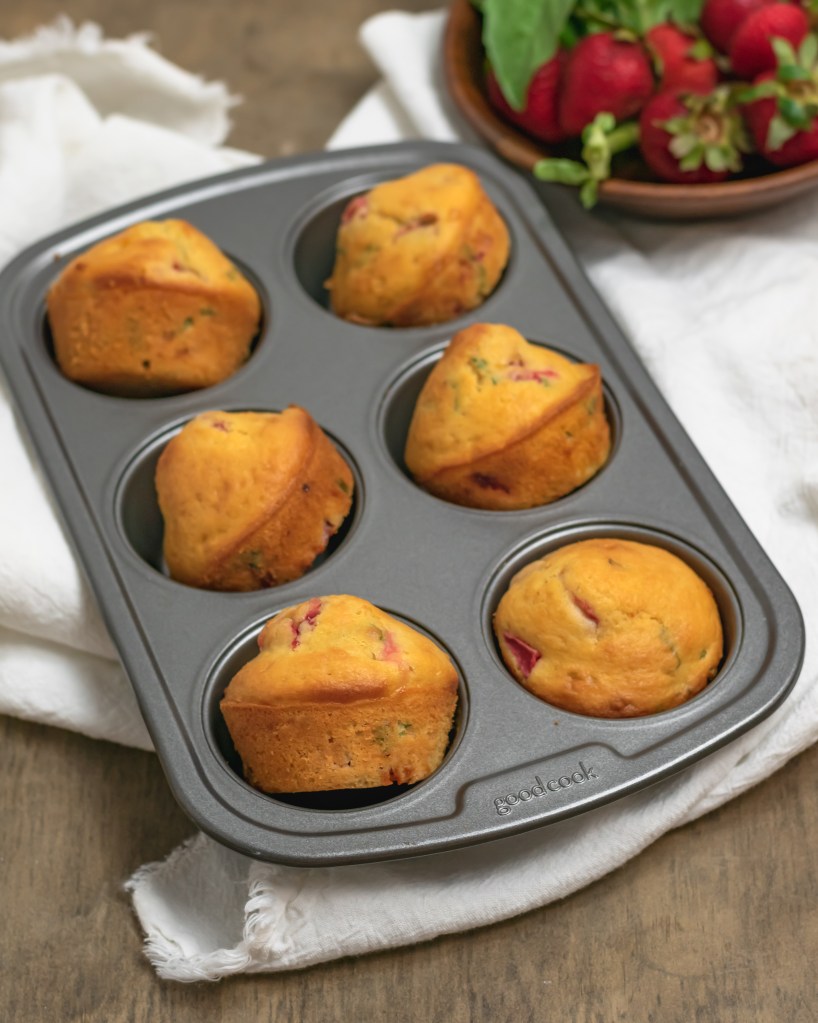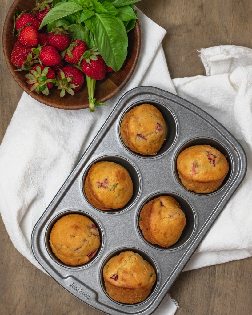 Simple, slightly sweet muffins filled with delicate strips of basil, chunks of fresh strawberries and a touch of lemon zest. A perfect little summertime treat.